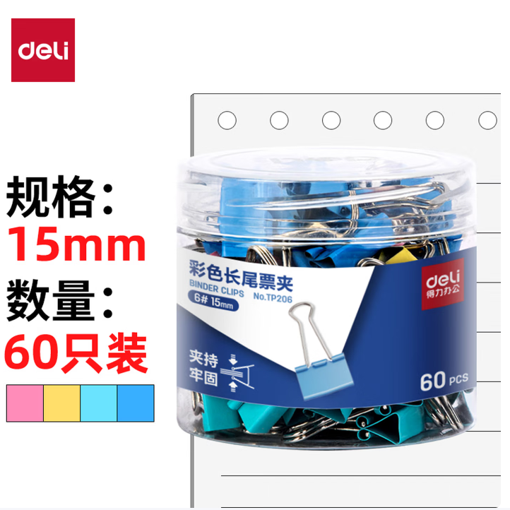 商品名称:得力TP206彩色长尾夹 15mm 6# 60只/筒 单位:筒
