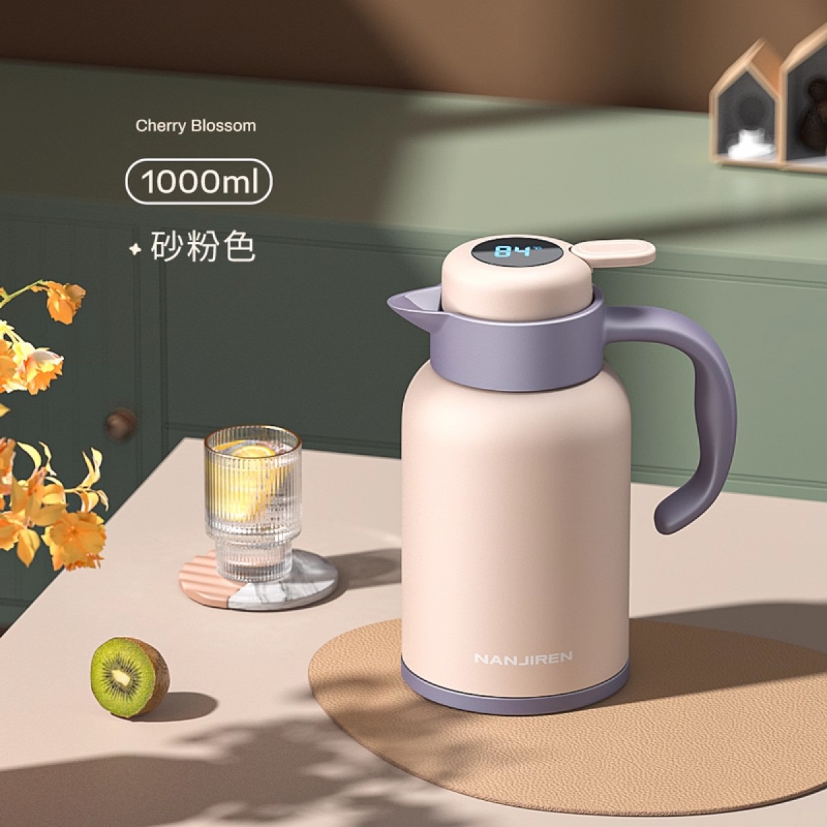 南极人保温水壶 砂粉色1000ML 智能显温 单位:个