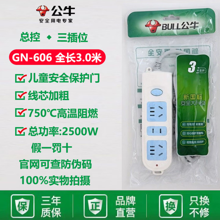 公牛GN-606总控三位排插 3米 单位:个