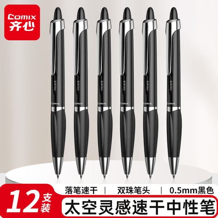 齐心X1速干按动中性笔 0.5mm双珠子弹头 黑色12支装