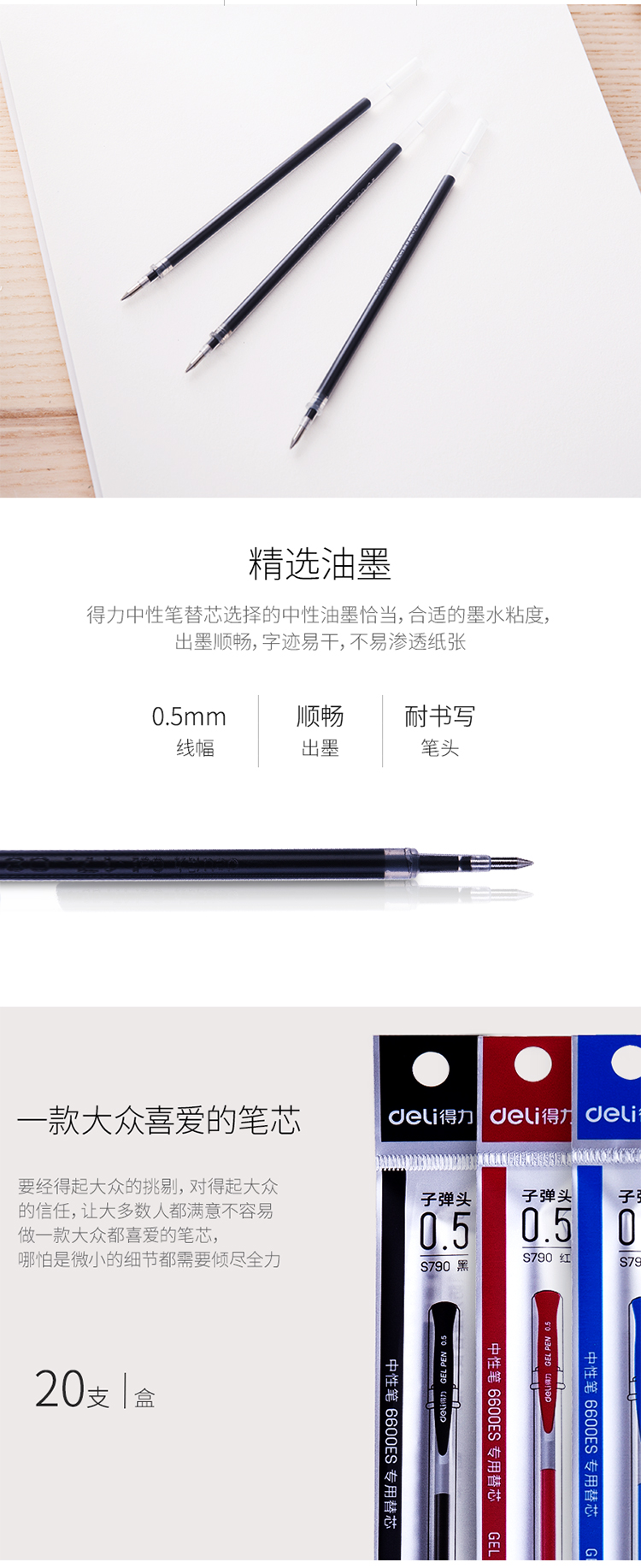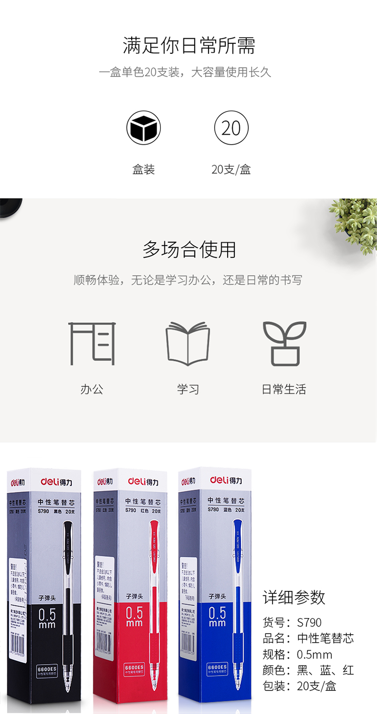 商品名称:得力S790中性笔笔芯6600ES替芯0.5mm黑色子弹头20支/盒