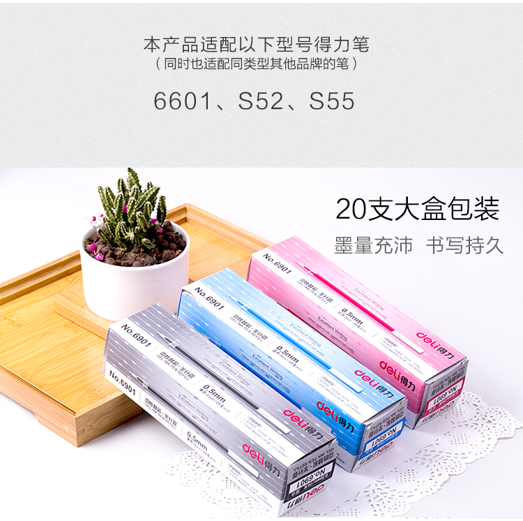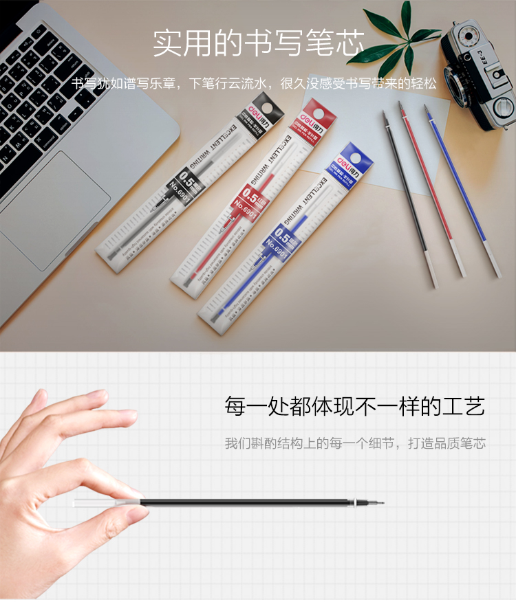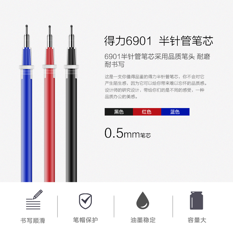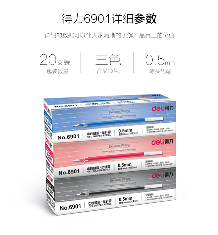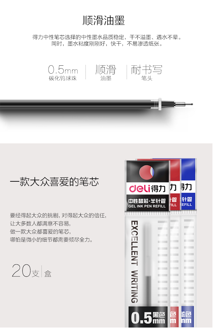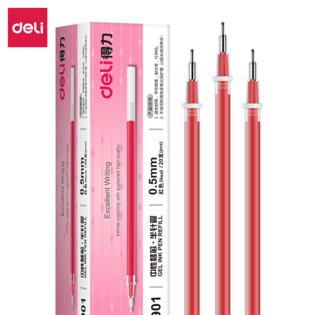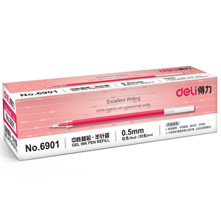 商品名称:得力(deli)0.5mm半针管红色笔芯 中性笔水笔签字笔替芯 20支/盒6901(单位:盒)