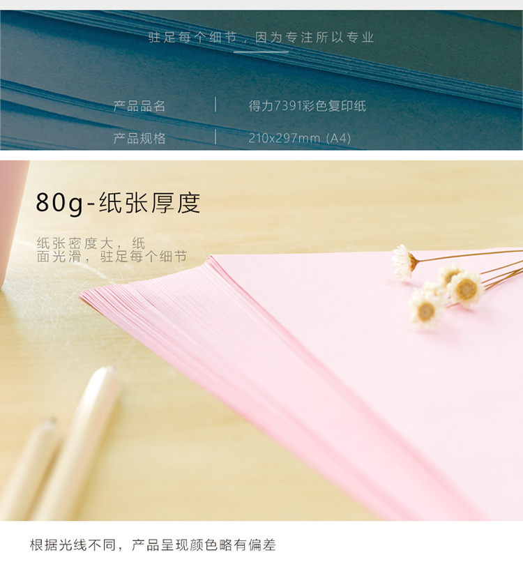 商品名称:得力7391彩色复印纸 A4 80g 浅红色 100张/包 单位:包