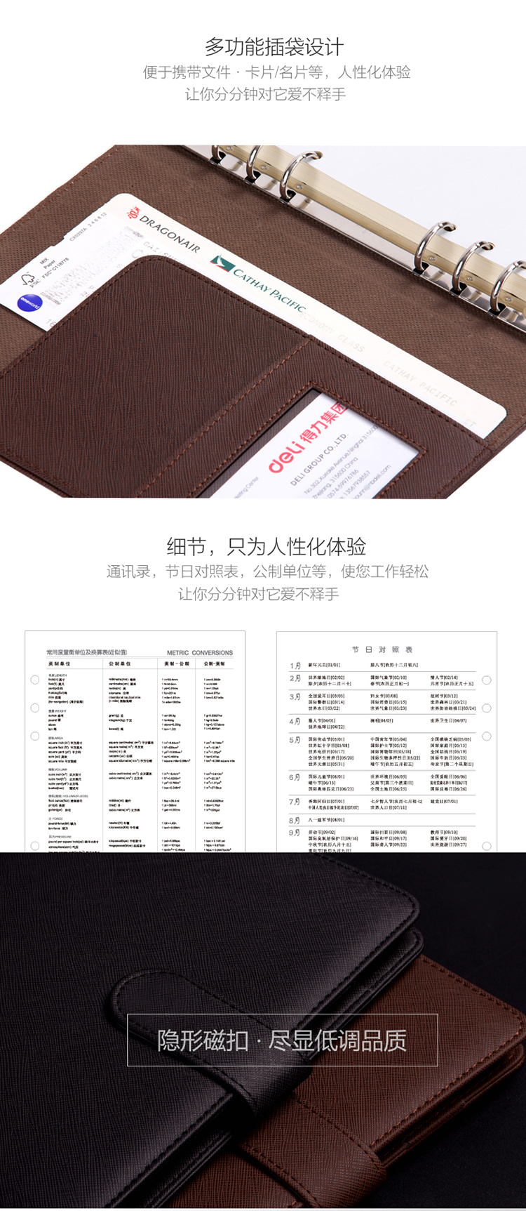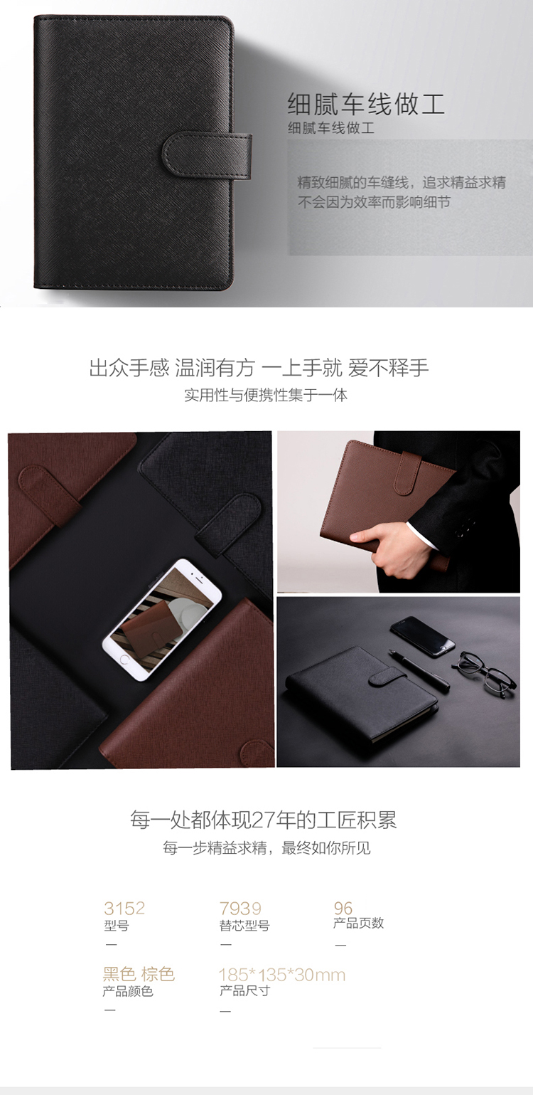 商品名称:得力3152皮面本/记事本7in/96页6孔多功能活页 颜色随机