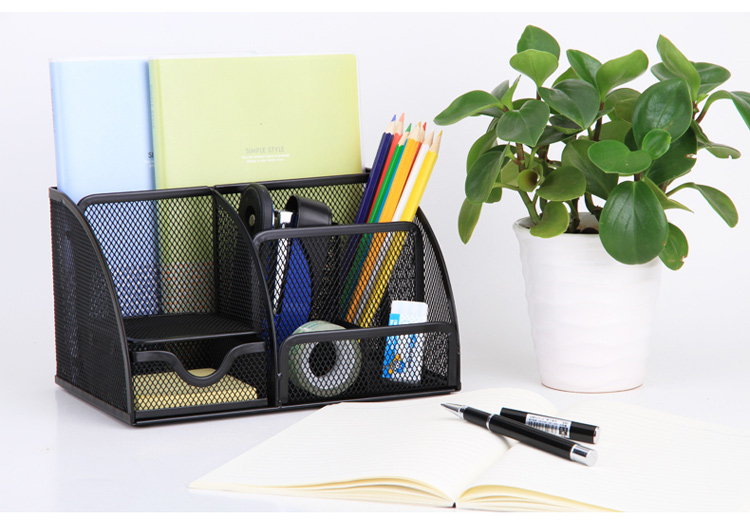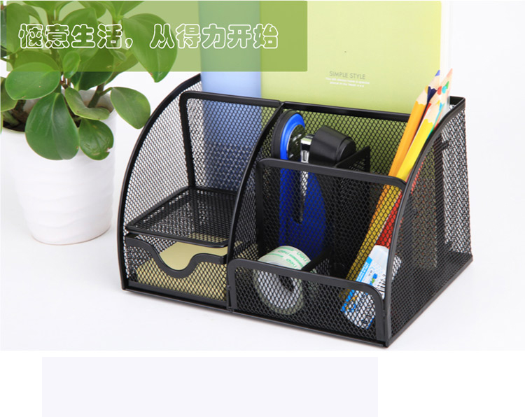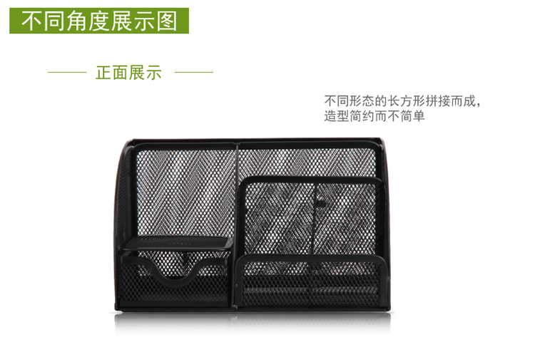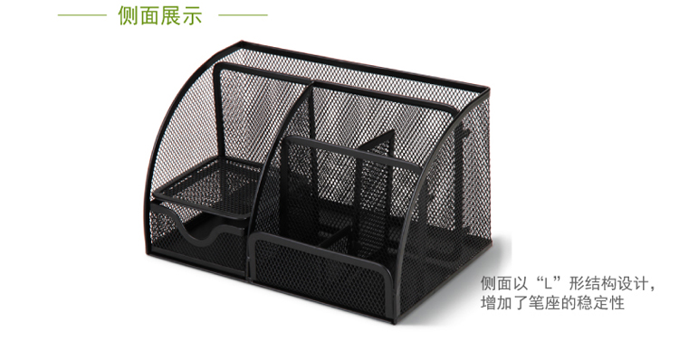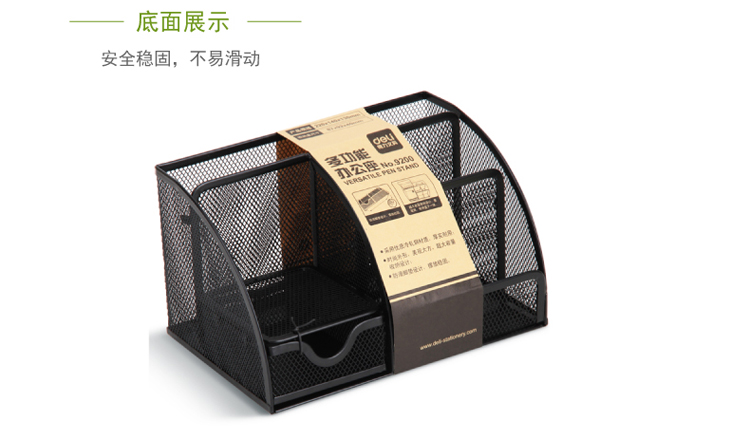 产品信息 Product Information 在一堆办公用品中寻找东西是让人头疼的事,得力这款笔筒让您抛弃烦恼,为每个文具设计其独有的空间,为您提供舒适优雅的生活。这款产品采用冲孔工艺,外观大方;把常用的桌面办公文具结合在一起,使用方便、快捷,提高办公效率。产品展示 Products Exhibition 做工精致,方便耐用产品细节 Product Details