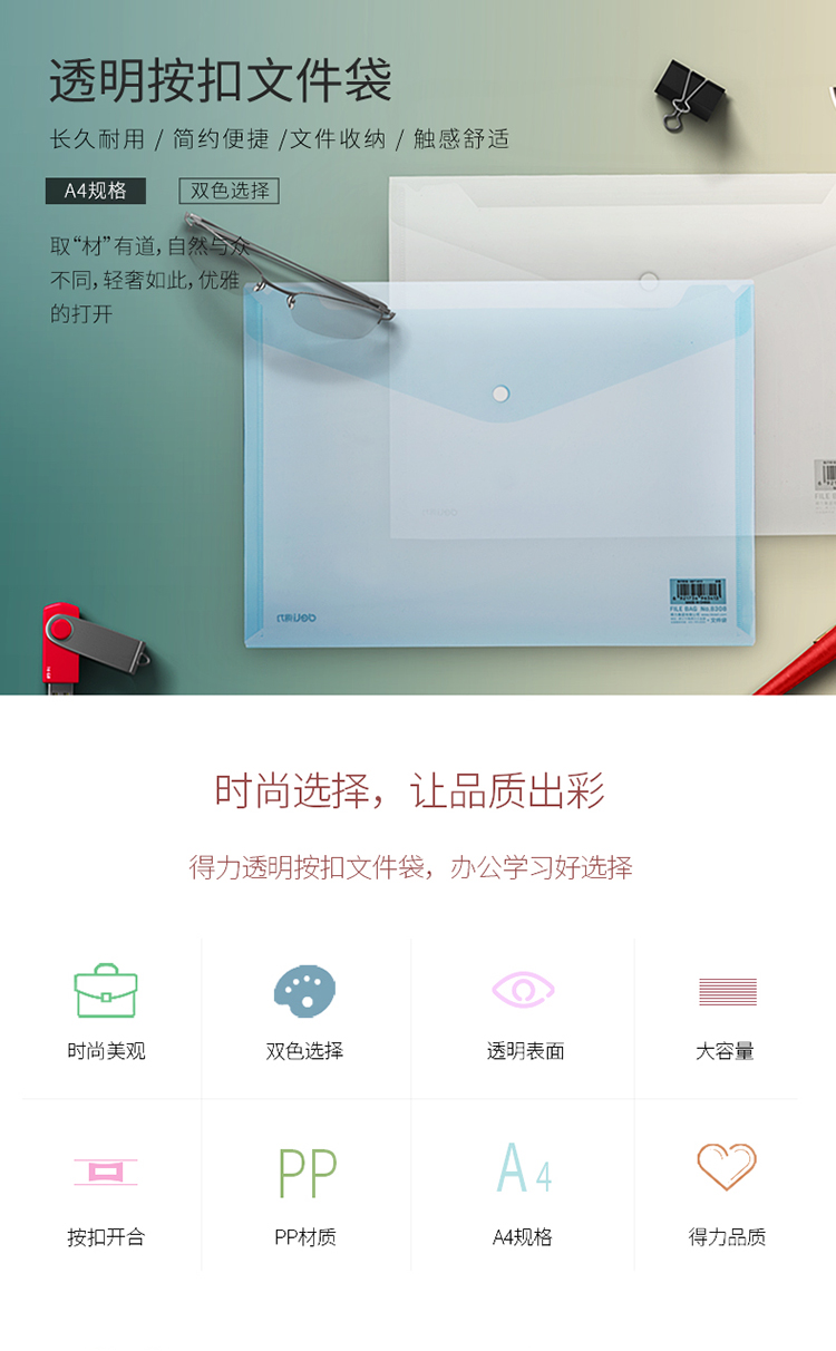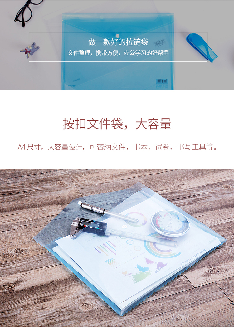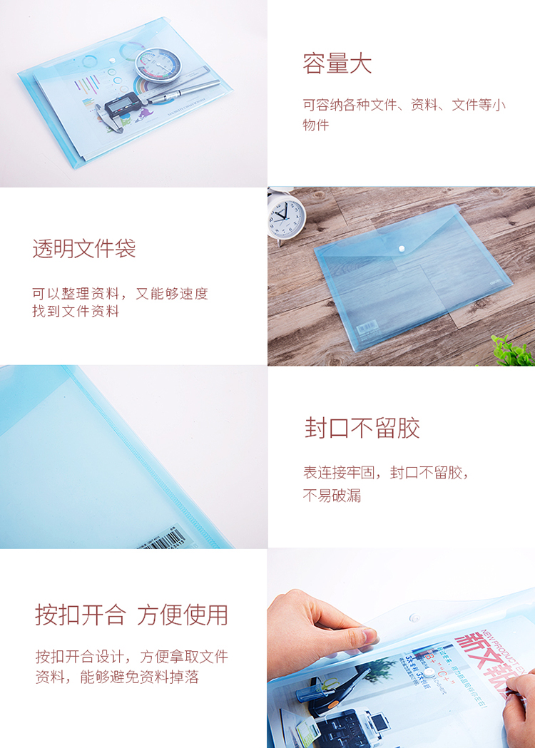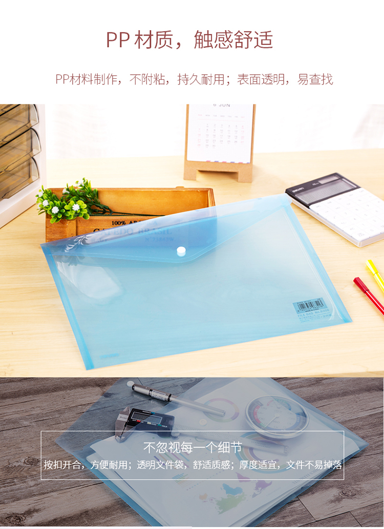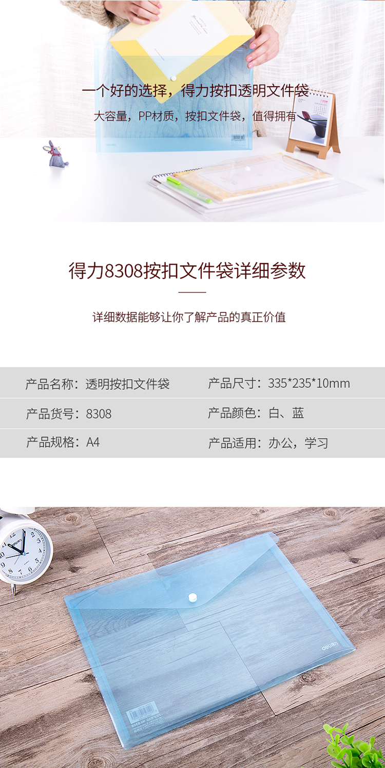 商品名称:得力(deli)10只A4透明按扣文件袋资料袋档案袋 蓝8308(单位:包)