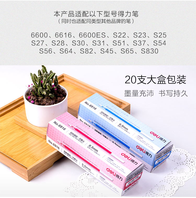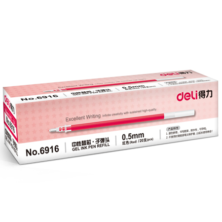 得力(deli)0.5mm红色中性笔笔芯 水笔签字笔子弹头替芯 20支/盒6916