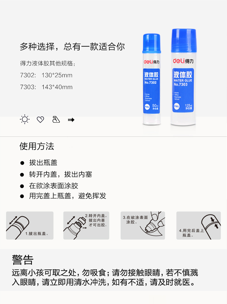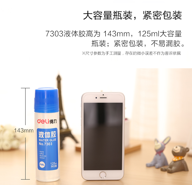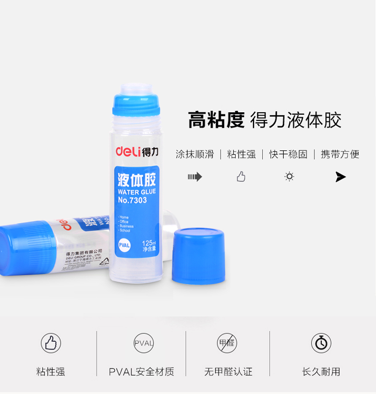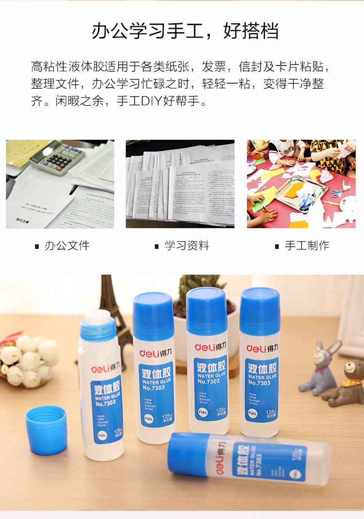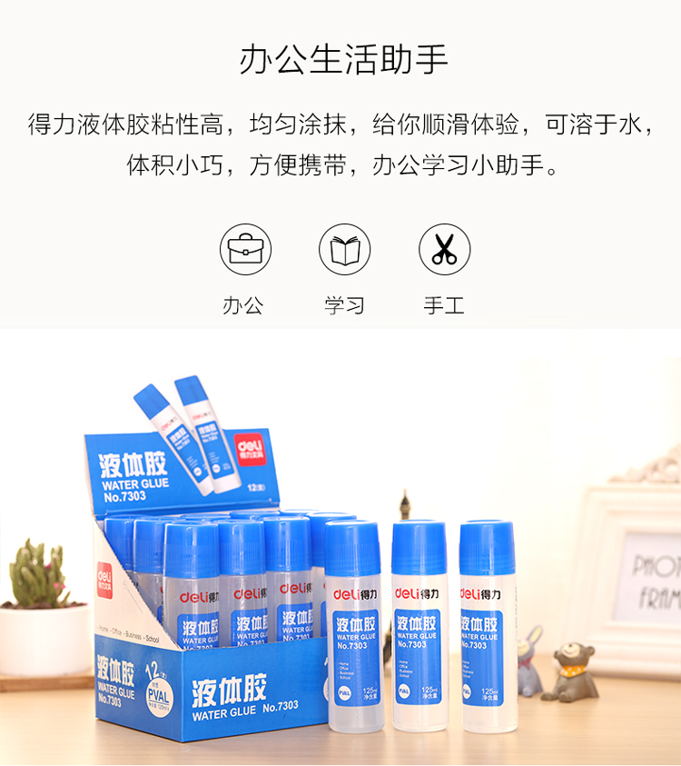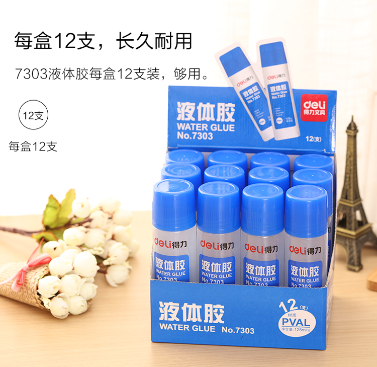 商品名称:得力(deli)7303 高粘度125ml液体胶/胶水 12只/盒