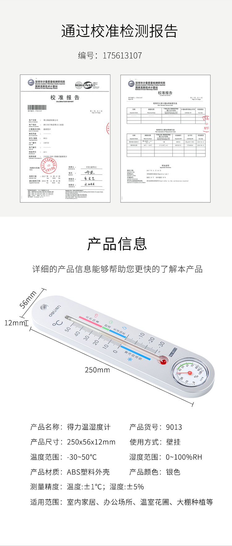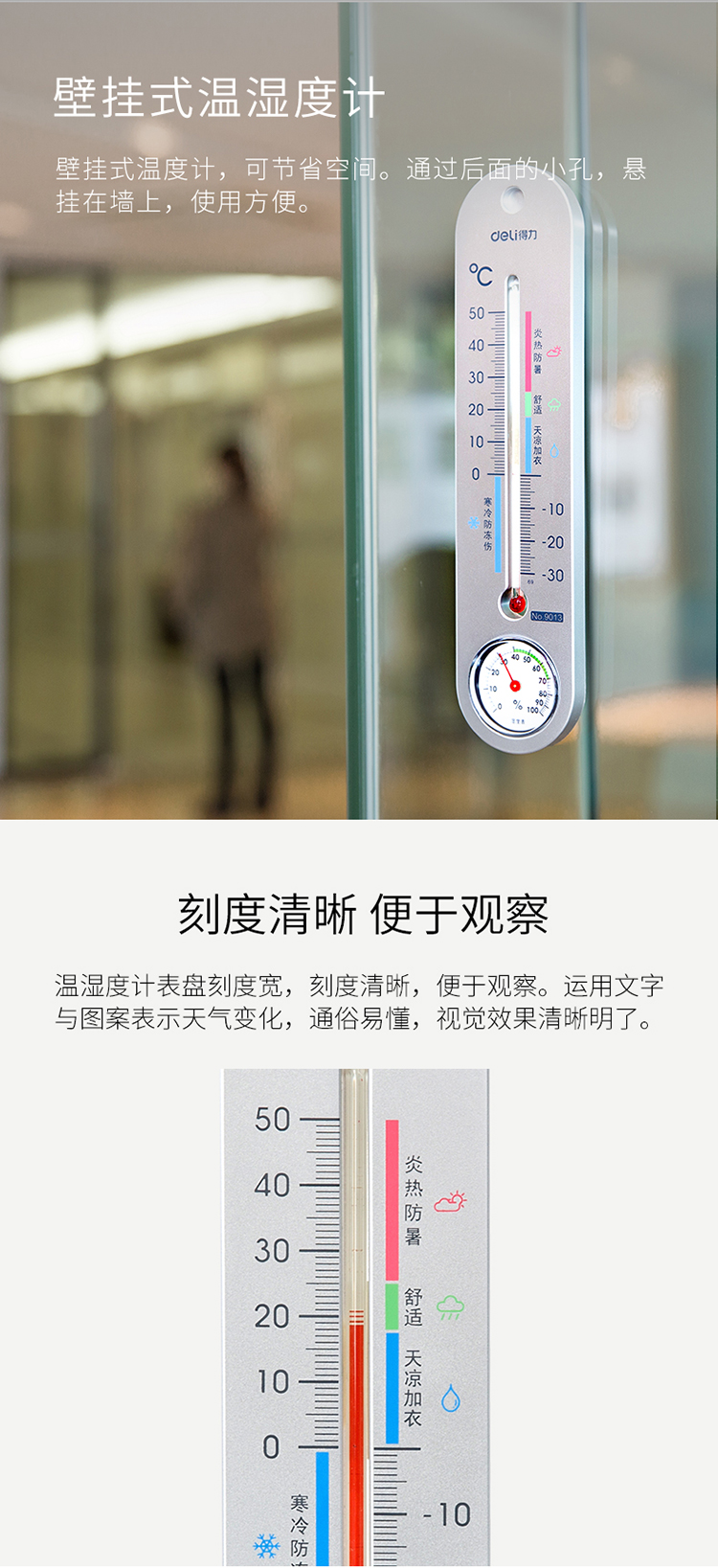 商品名称:得力挂壁式温湿度计9013