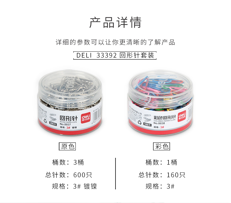 商品名称:得力(deli)33392 镀镍回形针套装 银色29mm回形针600枚+彩色29mm回形针160枚