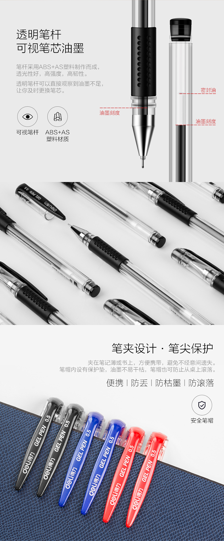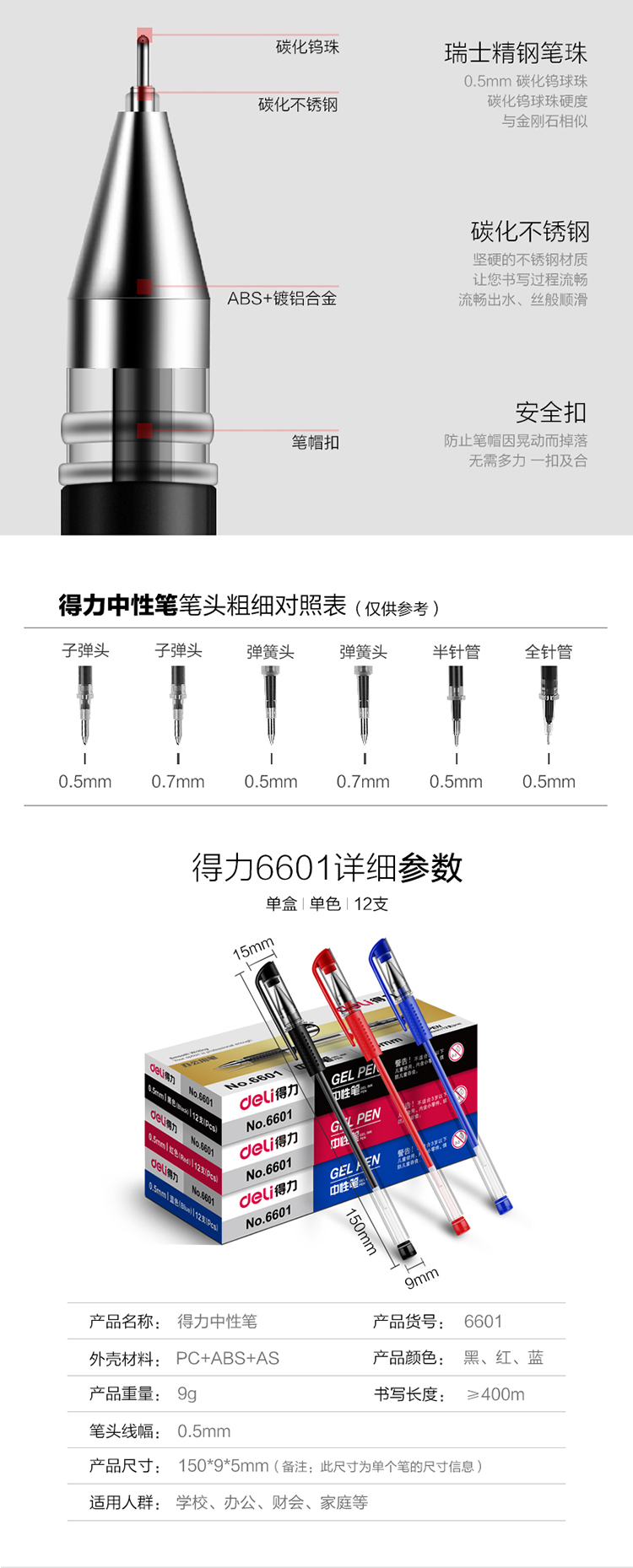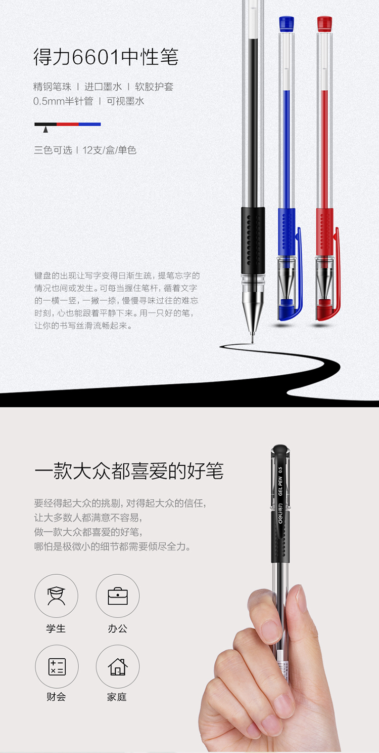 商品名称:得力(deli)0.5mm半针管红色中性笔水笔签字笔 12支/盒6601