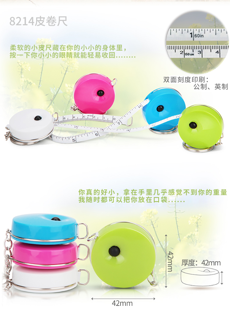 商品名称:得力(deli) 8214 糖果色迷你便携小皮卷尺 颜色随机 1.5米 创意钥匙扣