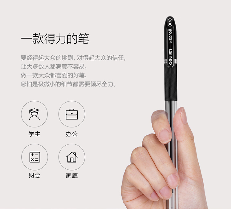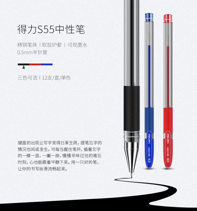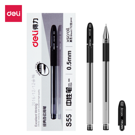 商品名称:得力(deli)0.5mm半针管黑色中性笔 碳素水笔签字笔 12支/盒S55