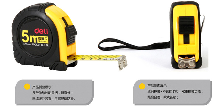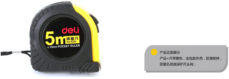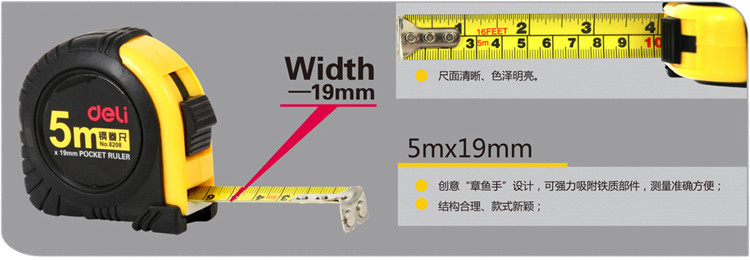 规格:5m×19mm;颜色:黄色;包装:卡式包装;材质:抗摔ABS,50°中碳钢制作尺带