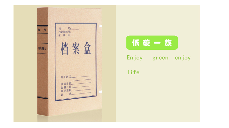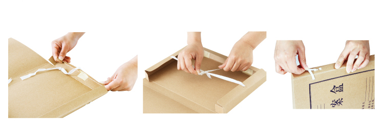 尺寸信息 Size Information 1. 背脊可书写,便于文件分类管理,易查找2. 正面可书写信息全面,可对文件详细标识3. 牛皮纸坚韧度、抗撕裂强度,破裂强度高档案盒实用过程展示使用:将文件放入档案盒内,绑好绳子,闭合档案盒,再将扣子扣好