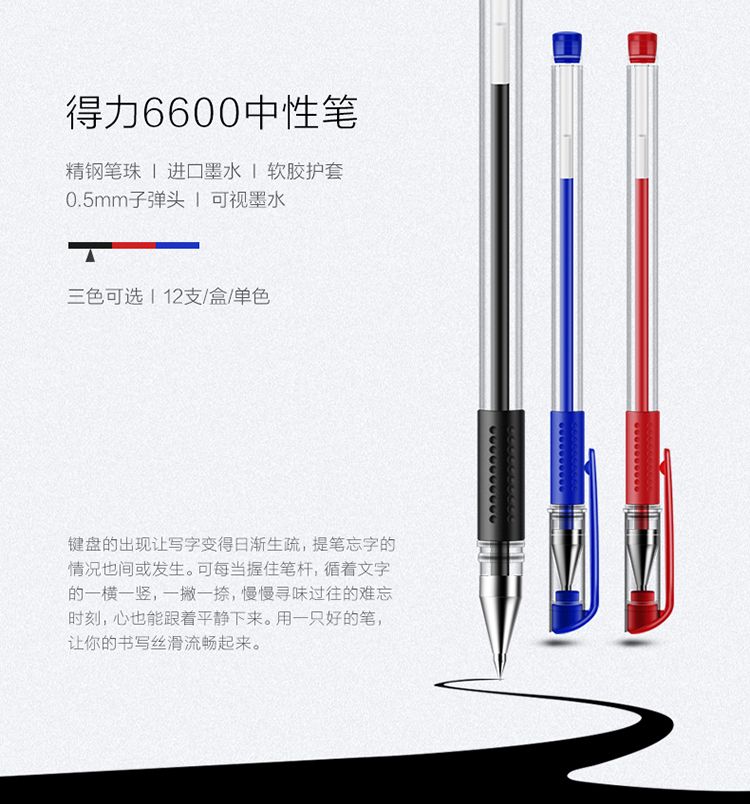 商品名称:得力(deli)6600黑色0.5mm经典办公中性笔水笔 子弹头签字笔 12支/盒