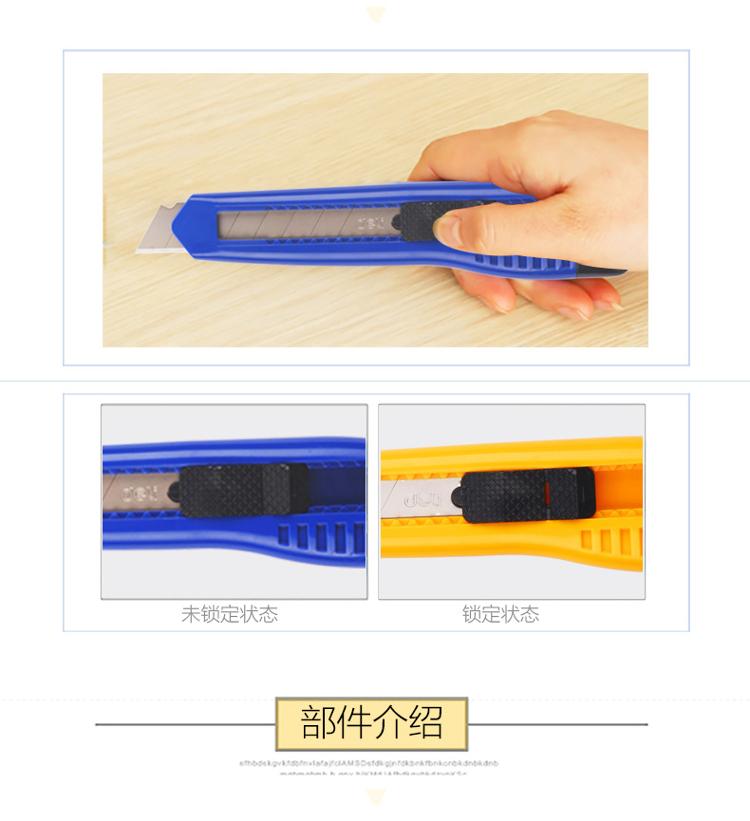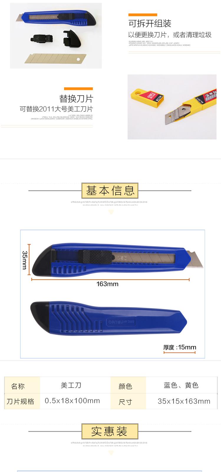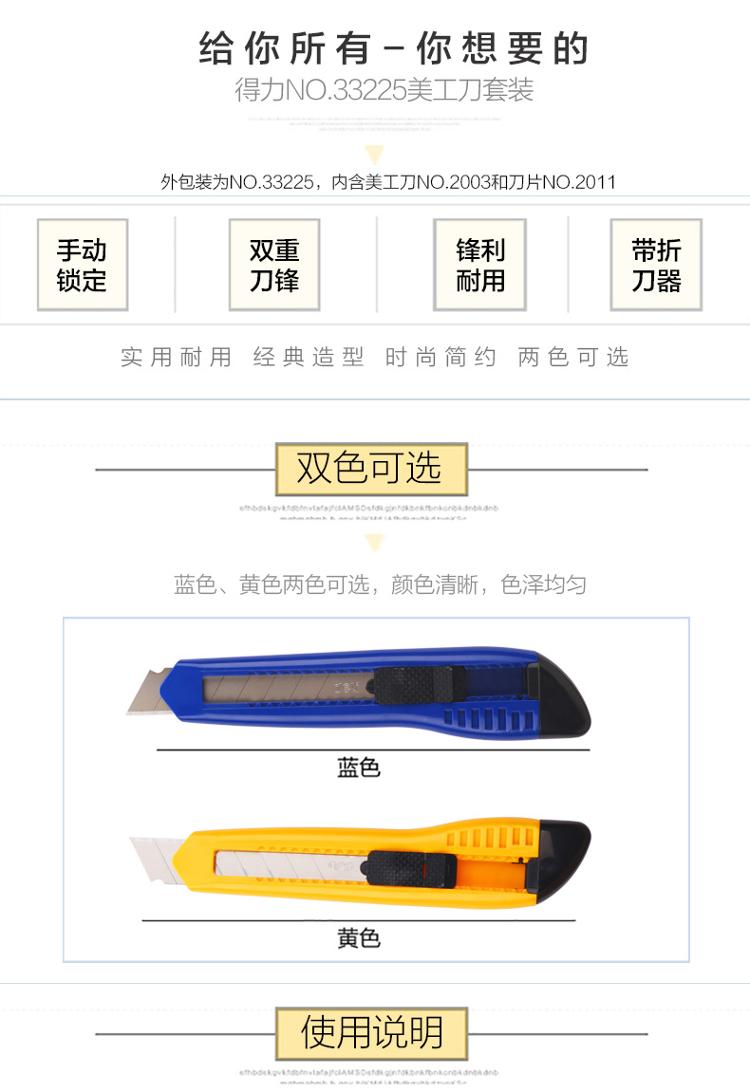 商品名称:得力(deli)33225 大号耐用美工刀套装 美工刀2把+10片装刀片1盒 黄/蓝 混色装