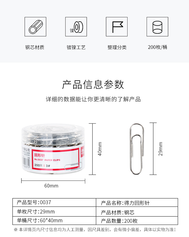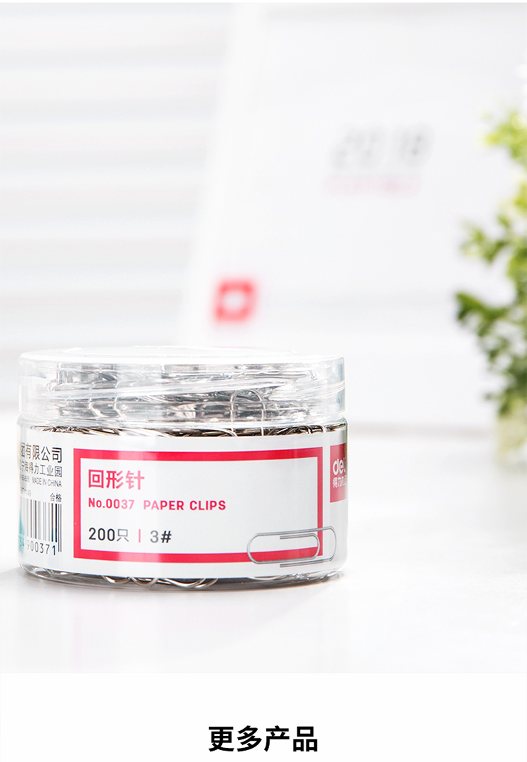 商品名称:得力(deli)0037 29mm镀镍回形针200枚/筒