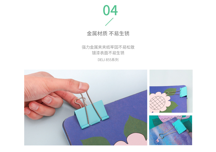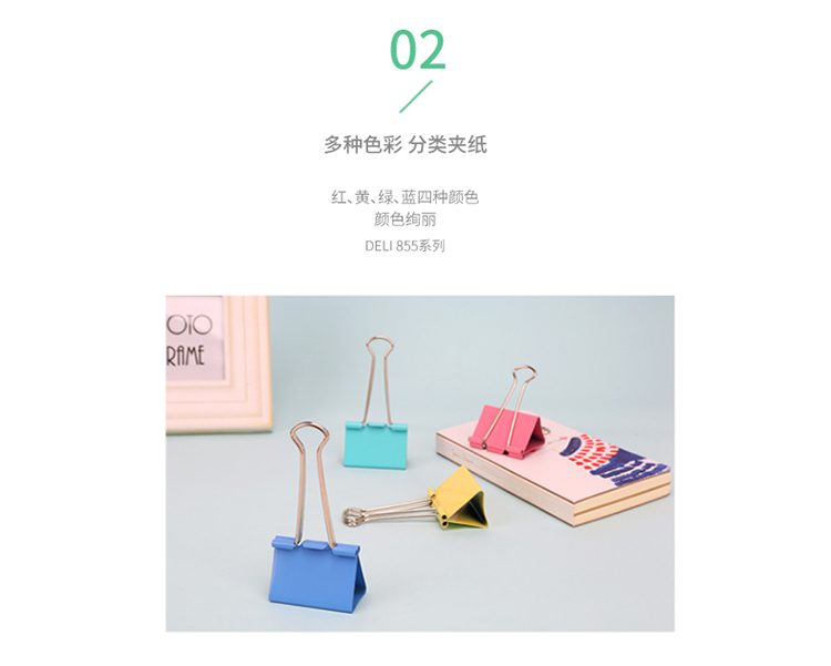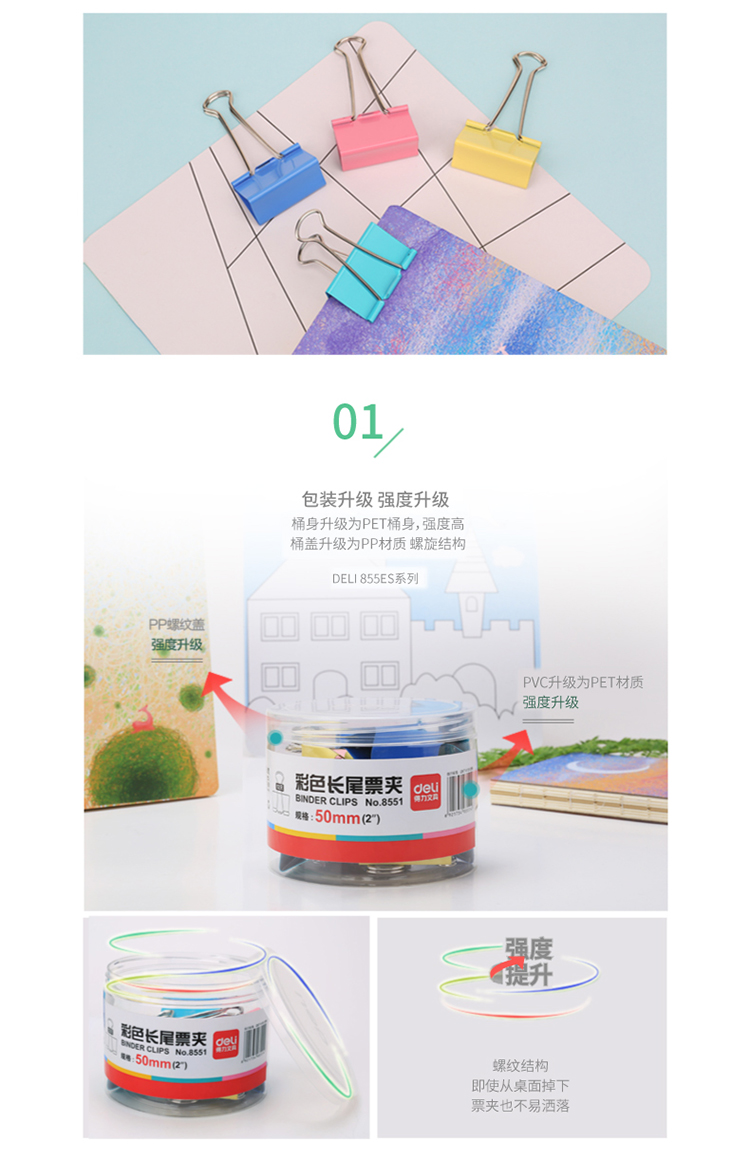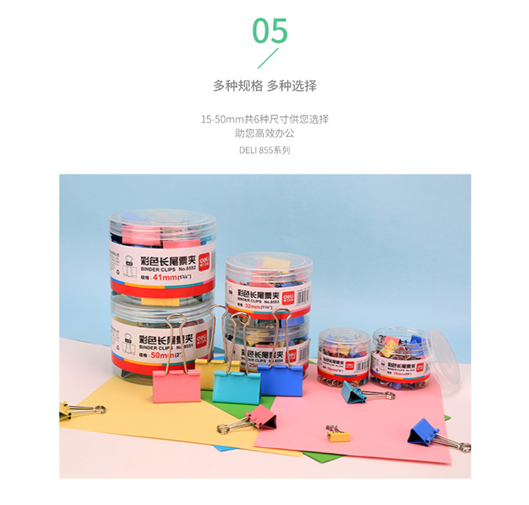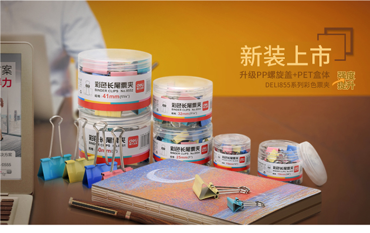 商品名称:得力15mm彩色长尾票夹(筒装)8556