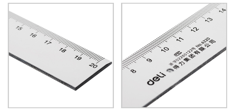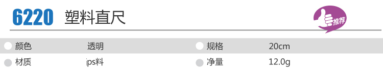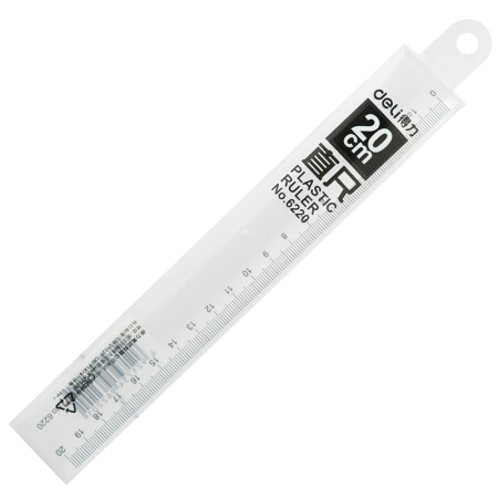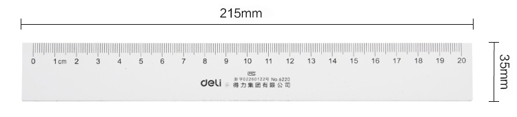 产品信息 Product Information 尺寸信息 Size Information 得力6220塑料直尺的规格为20cm,尺寸为215×35×2mm产品细节 Product Details 得力6220塑料直尺的规格为20cm,最大可量取20cm尺寸的产品,得力尺子采用ps料,透明