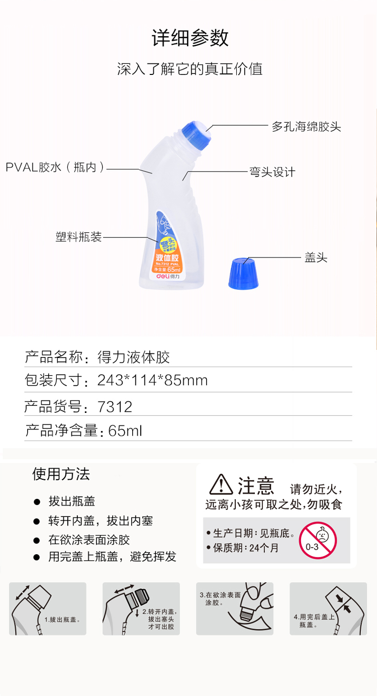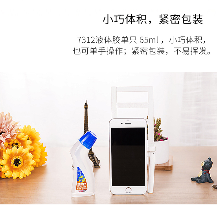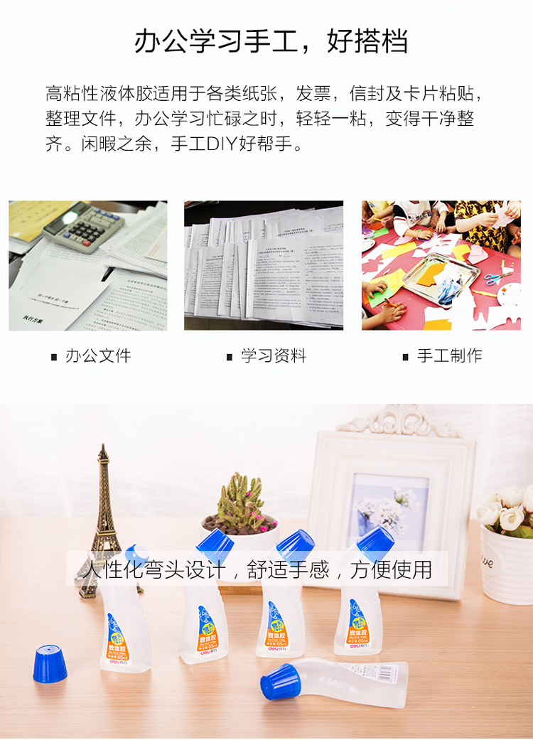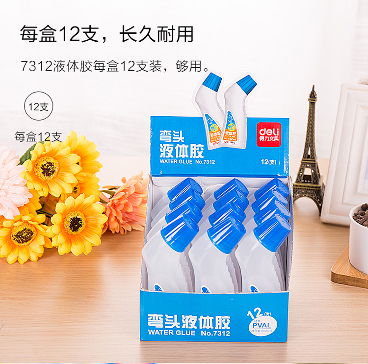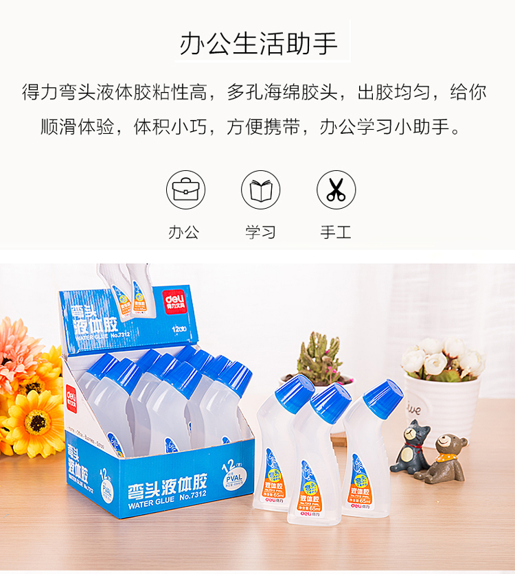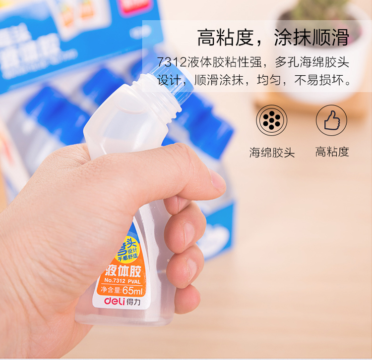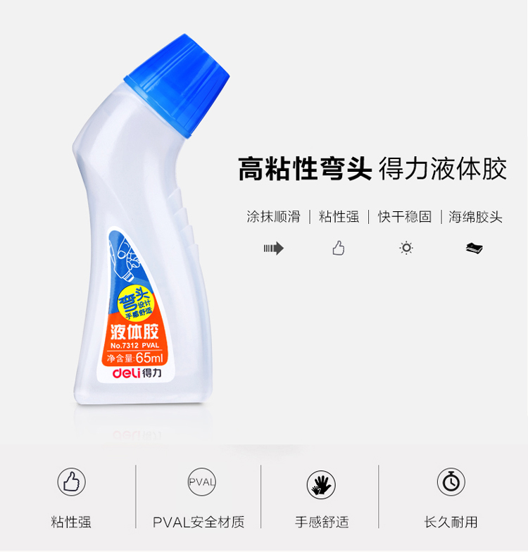 商品名称:得力(deli)7312 高粘度弯头胶水/液体胶水 65ml 12只装 蓝色