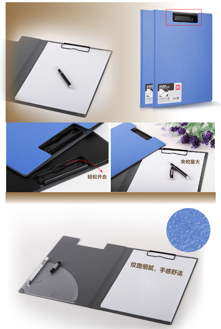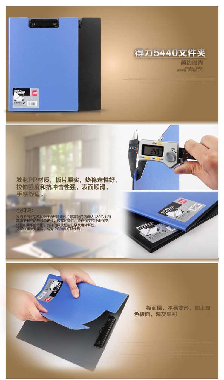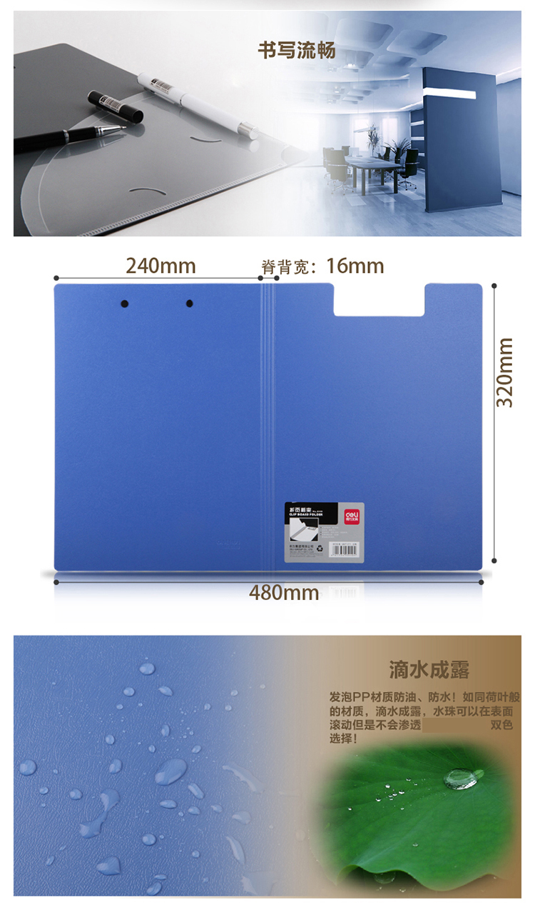 商品名称:得力(deli)5440 时尚全新工艺加厚PP材质折页板夹 A4单只装 蓝色