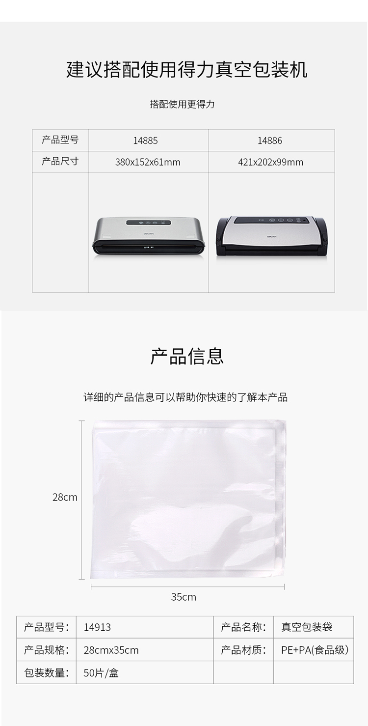 商品名称:得力14913真空包装袋 28*35CM 50片/盒 单位:盒
