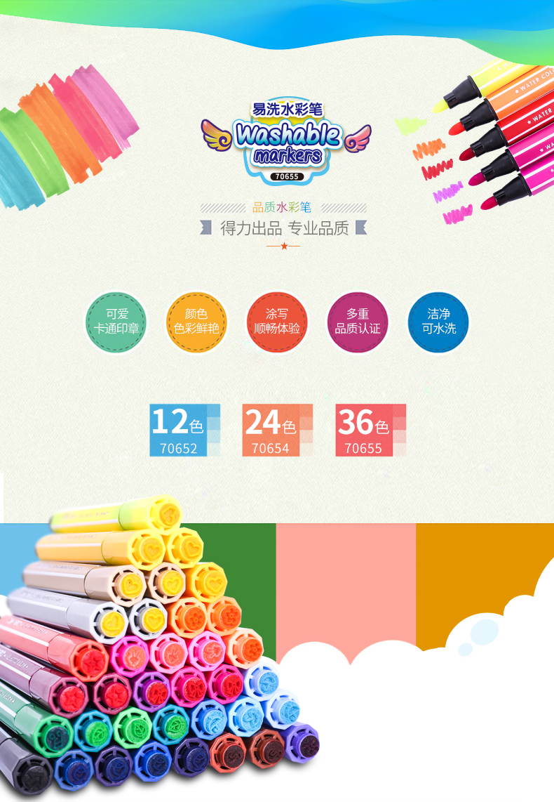 商品名称:得力(deli)70655 大容量印章可洗水彩笔 36色