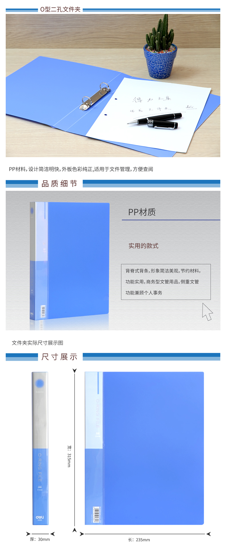 商品名称:得力(deli)5382 A4二孔O型文件夹 蓝 单只