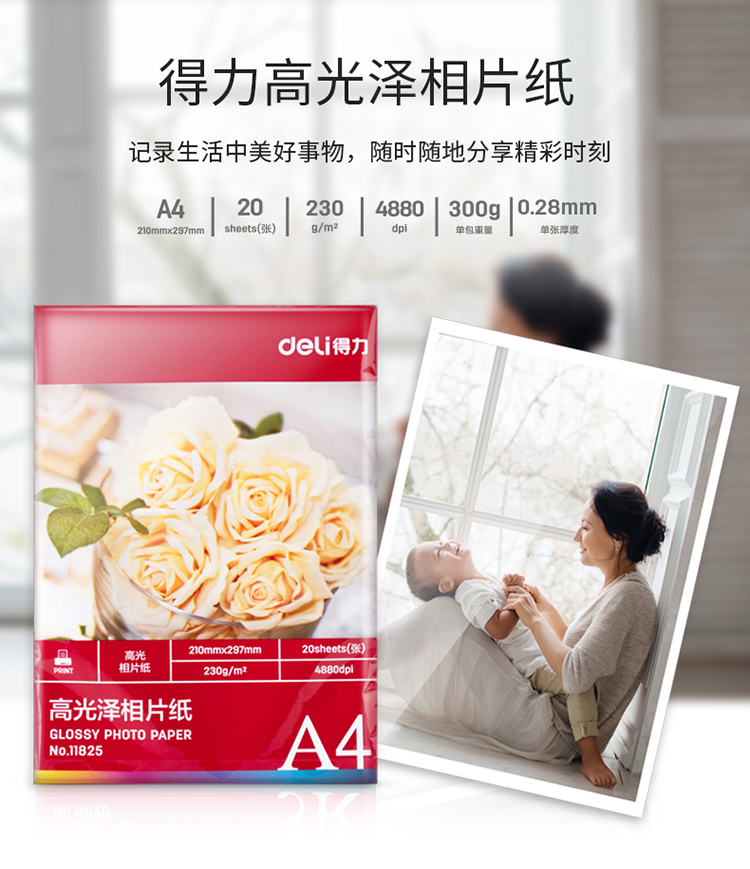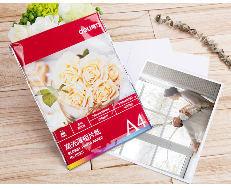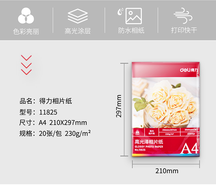 商品名称:得力(deli)11825 A4规格 230g/㎡高光相片纸/照片纸 20张/包