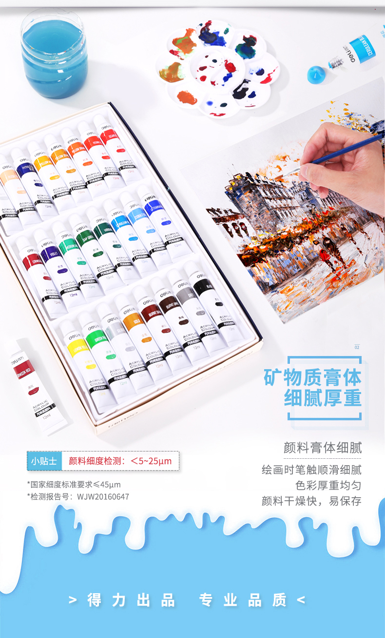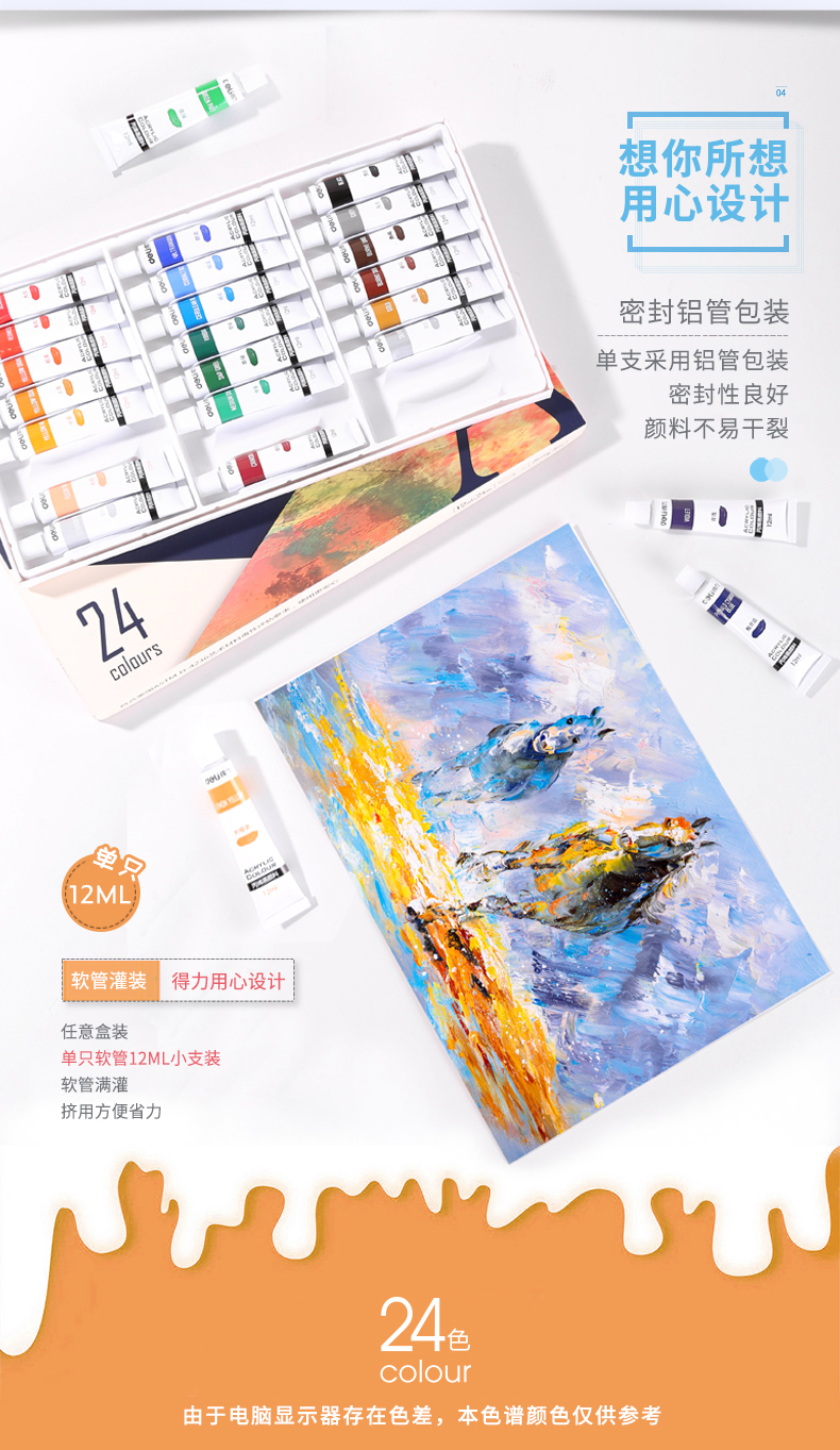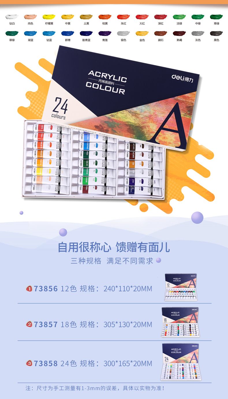 商品名称:得力(deli)73858 美术绘画丙烯颜料 24色盒装