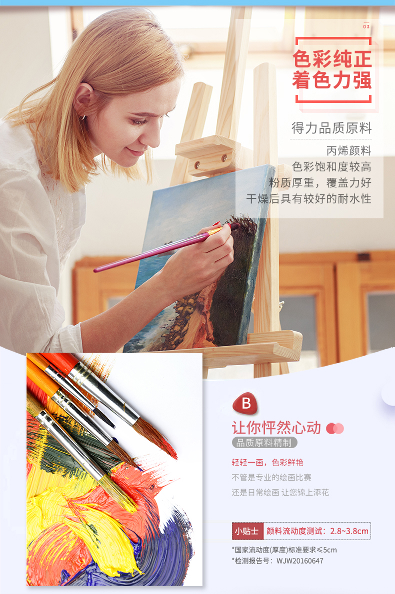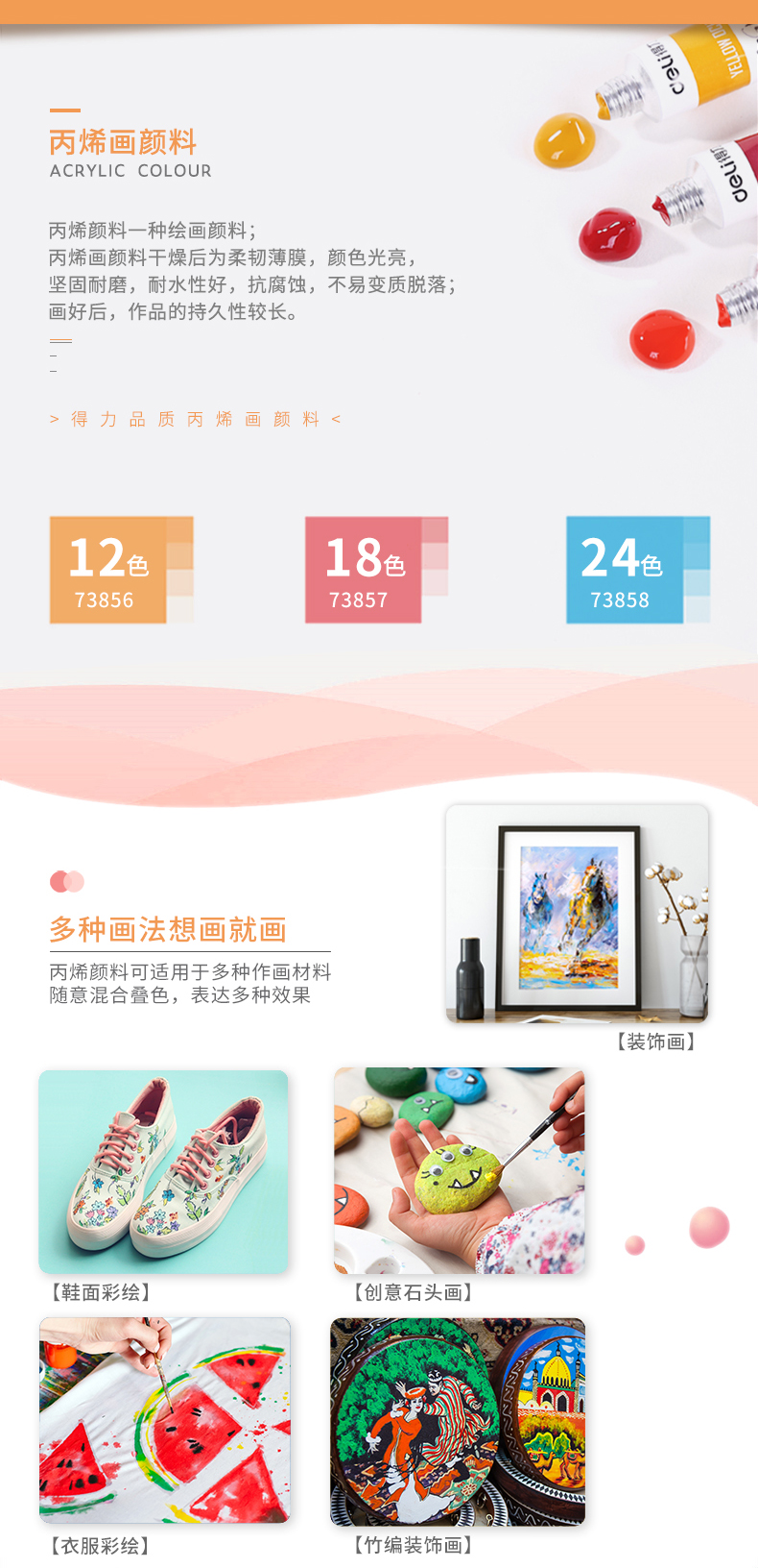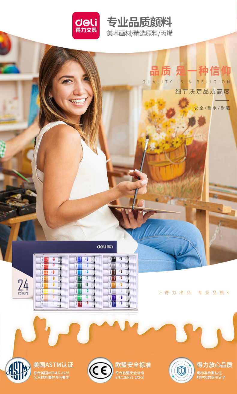 商品名称:得力(deli)73858 美术绘画丙烯颜料 24色盒装