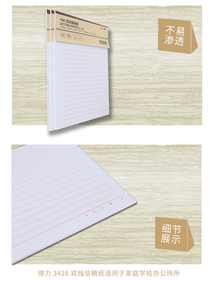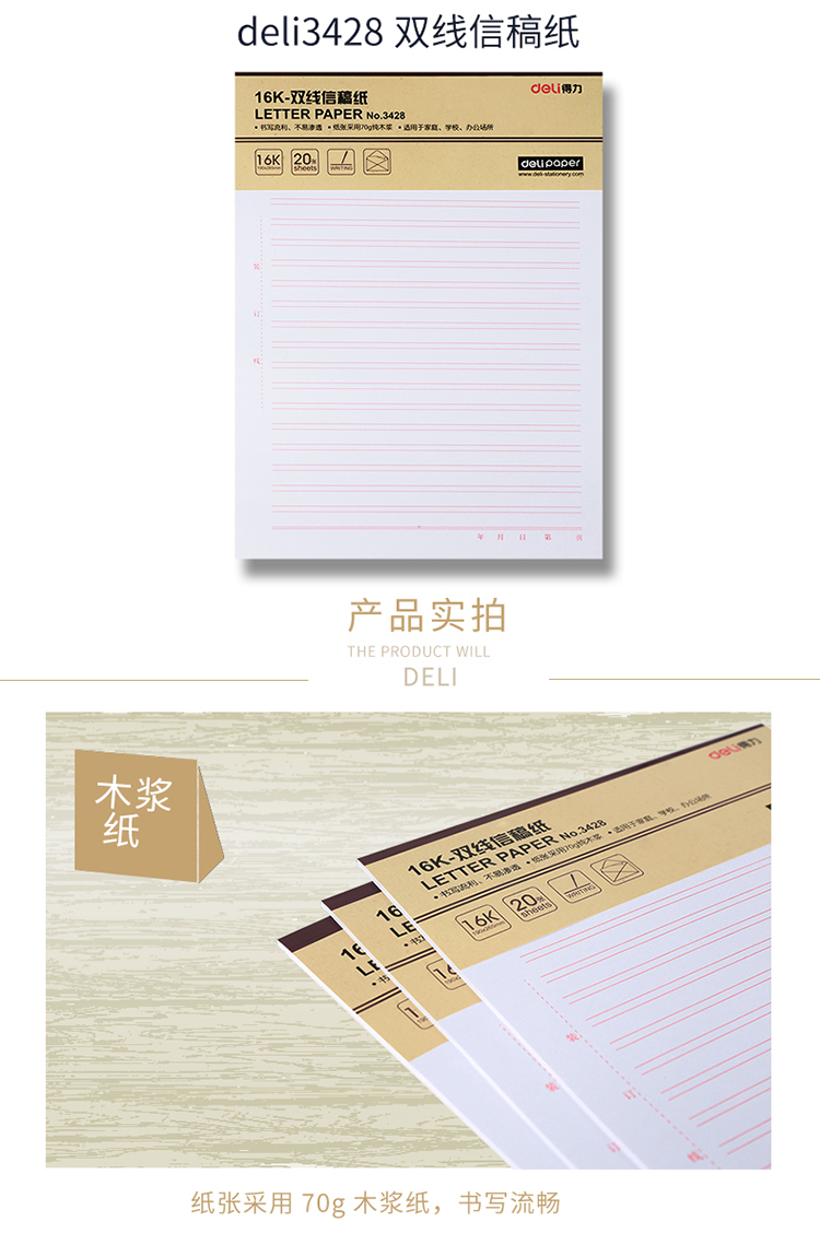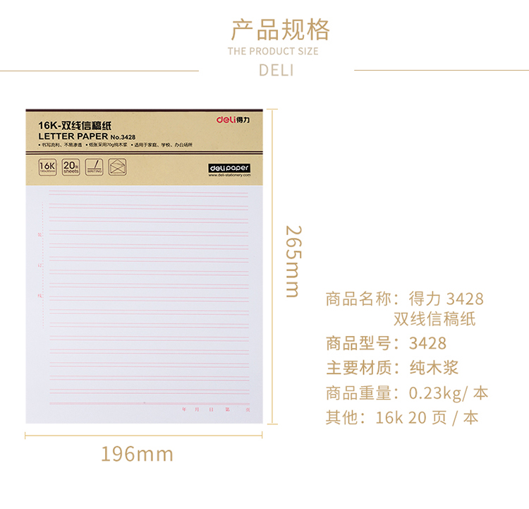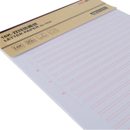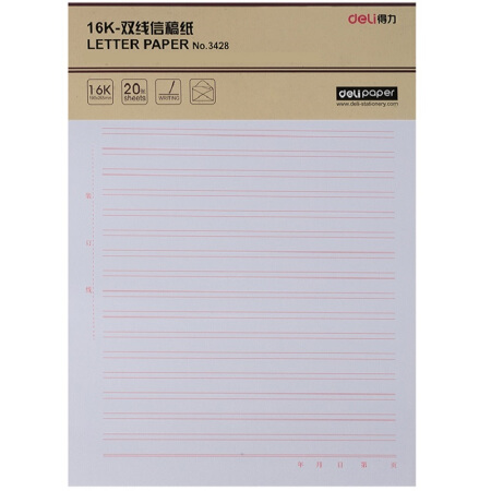 商品名称:得力3428双线信纸本子草稿纸16K/20页张 3本/包(单位.本)