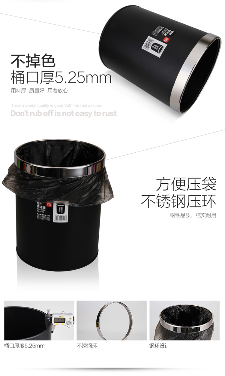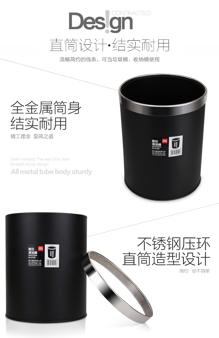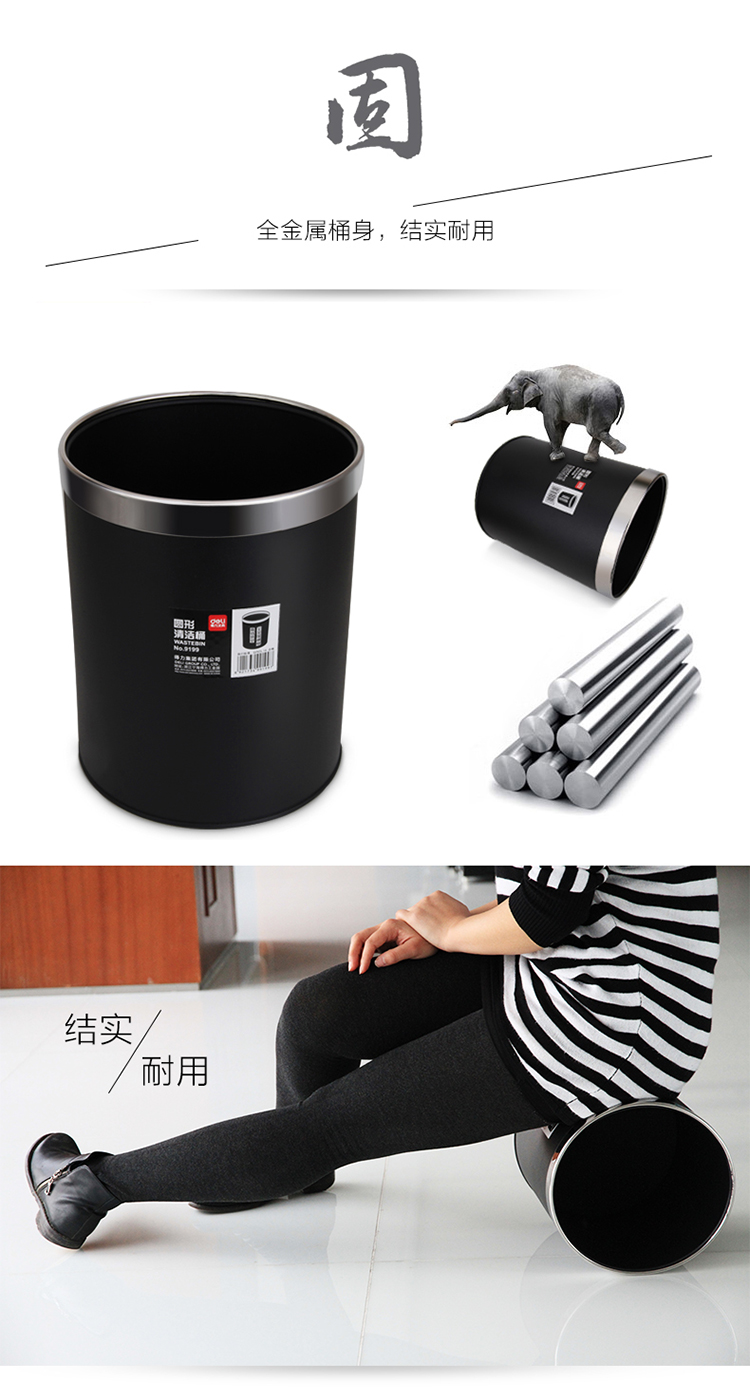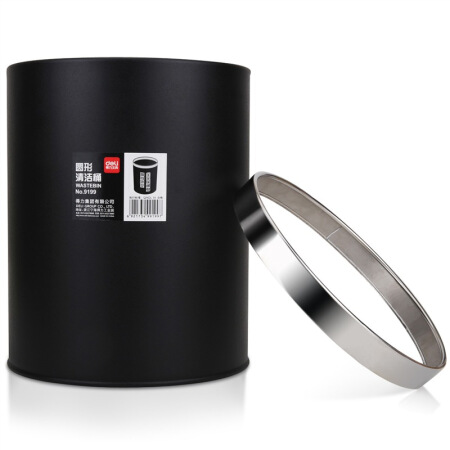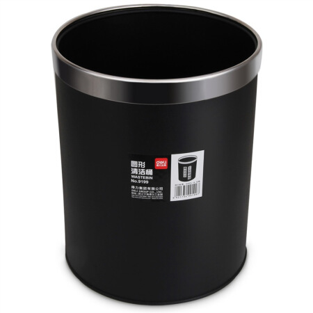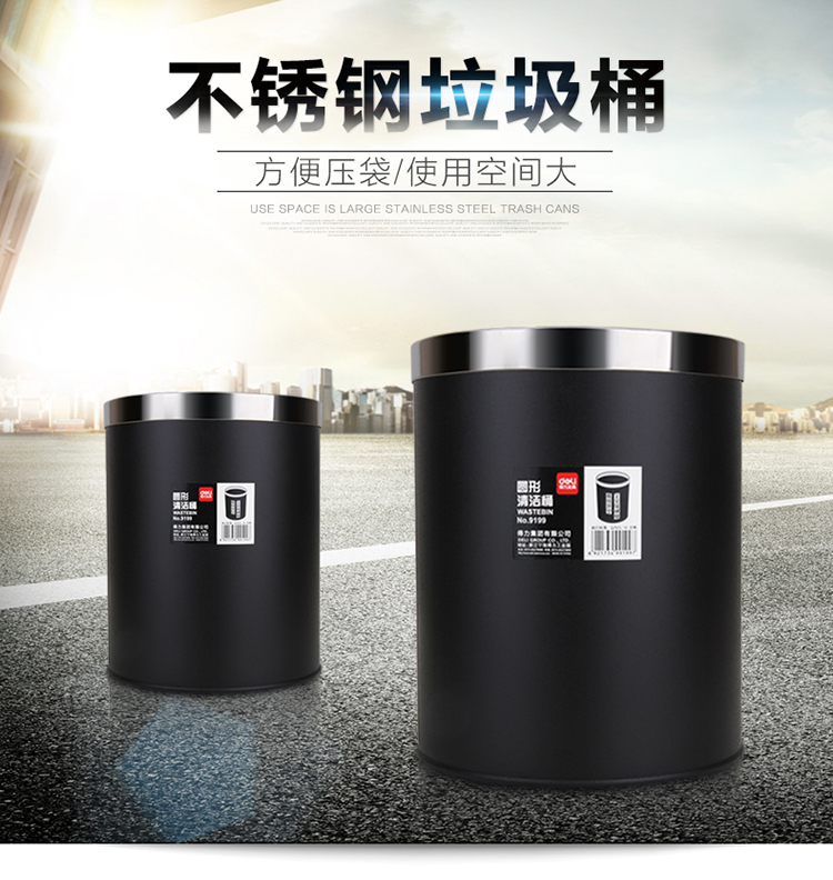 商品名称:得力(deli) 9199 办公家居经典圆形直桶不锈钢垃圾桶/纸篓/清洁桶 黑色 带压圈