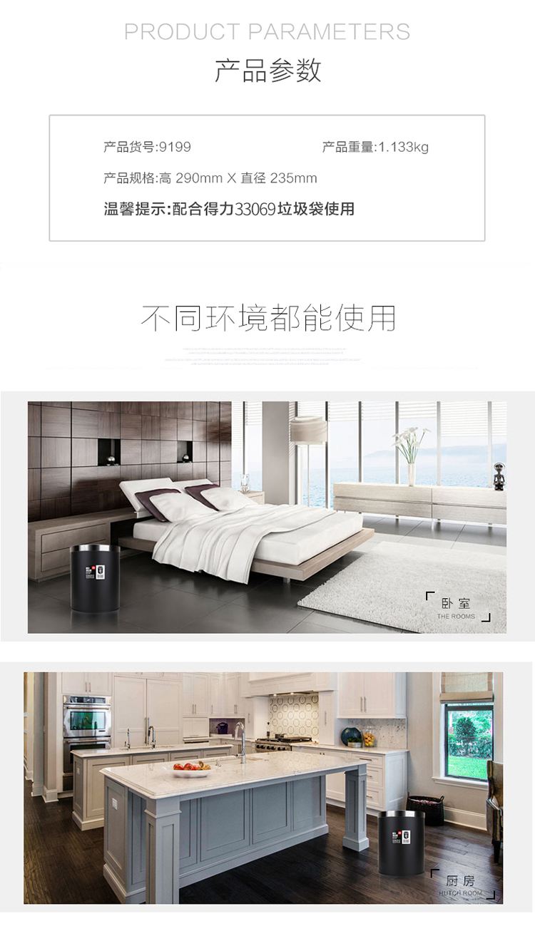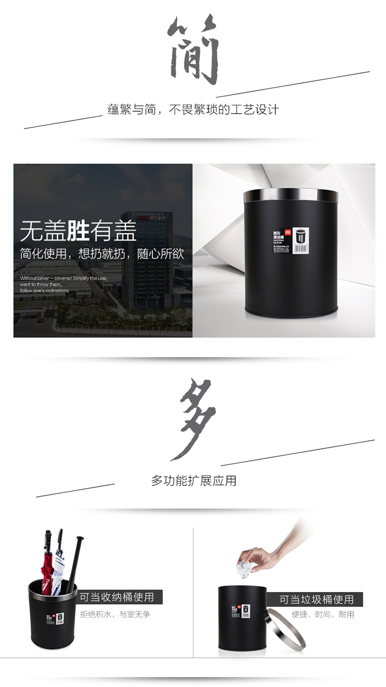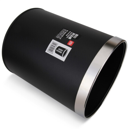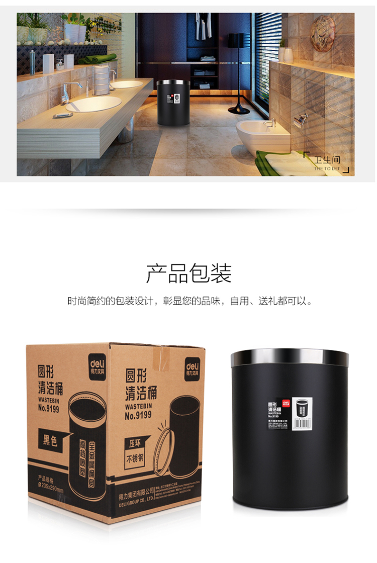 商品名称:得力(deli) 9199 办公家居经典圆形直桶不锈钢垃圾桶/纸篓/清洁桶 黑色 带压圈