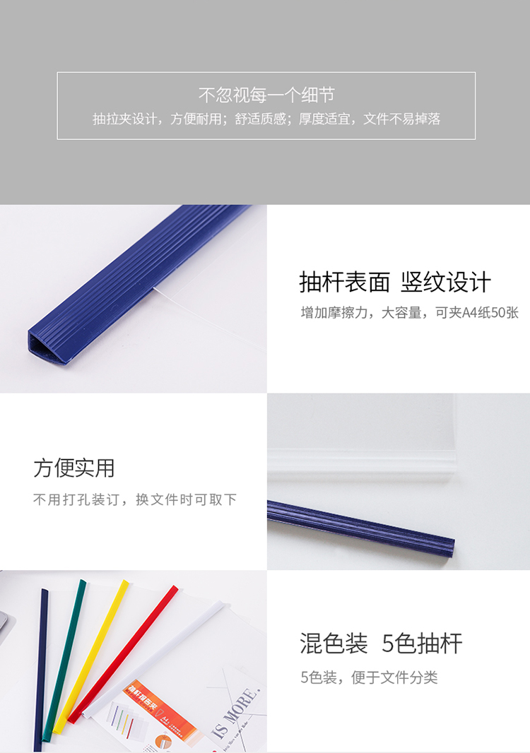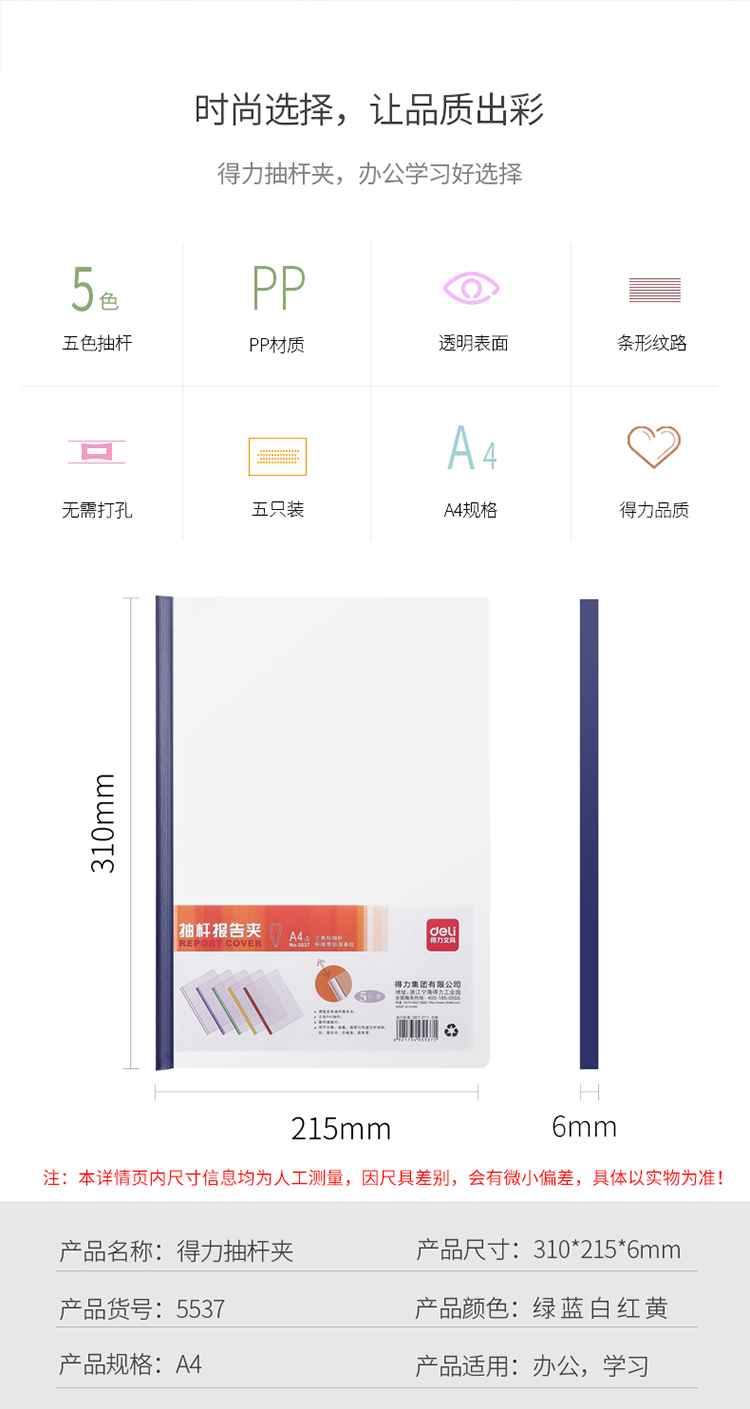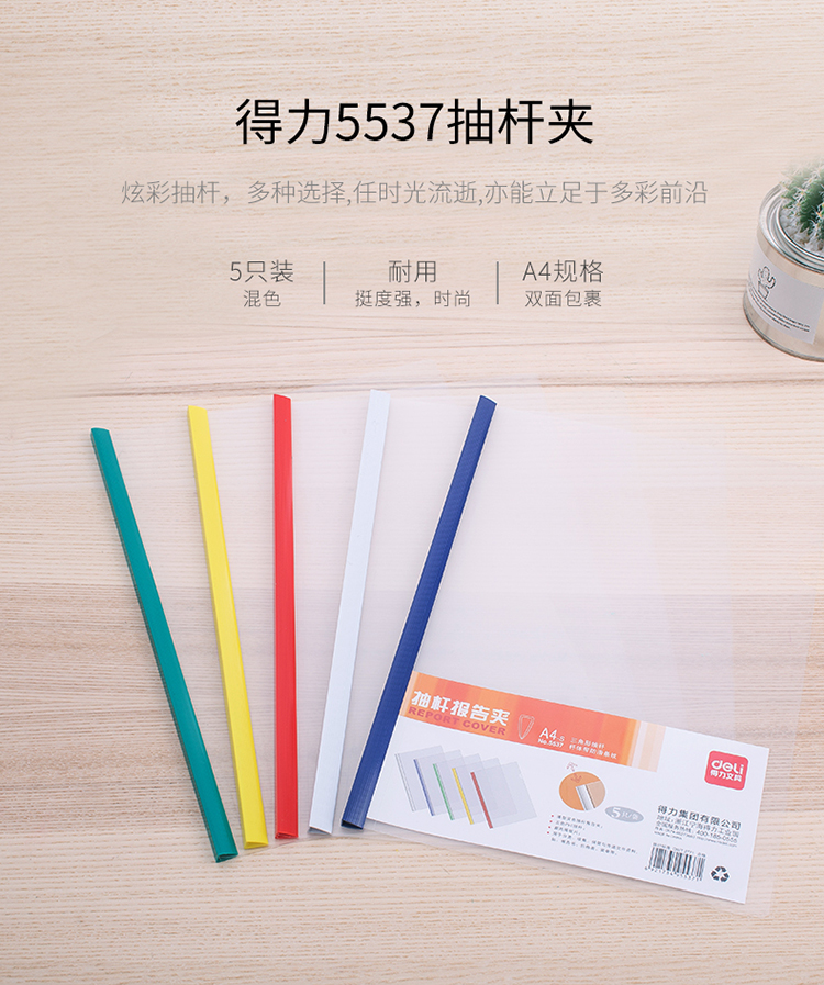 商品名称:得力5537 A4抽杆夹(5个/包)