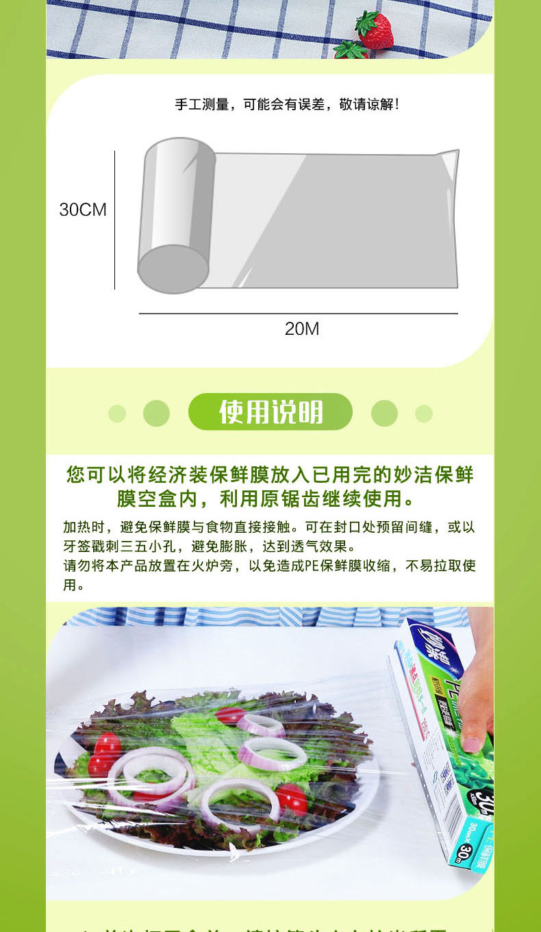 商品名称:妙洁 0306PE保鲜膜盒装20米*30cm