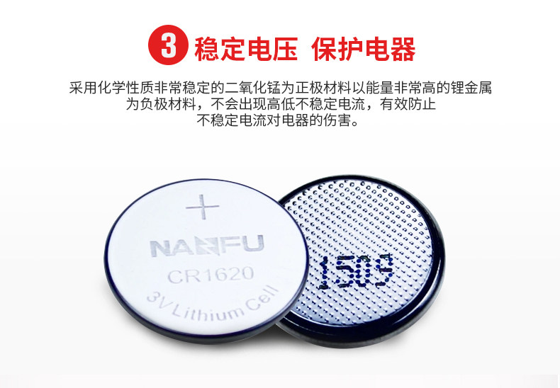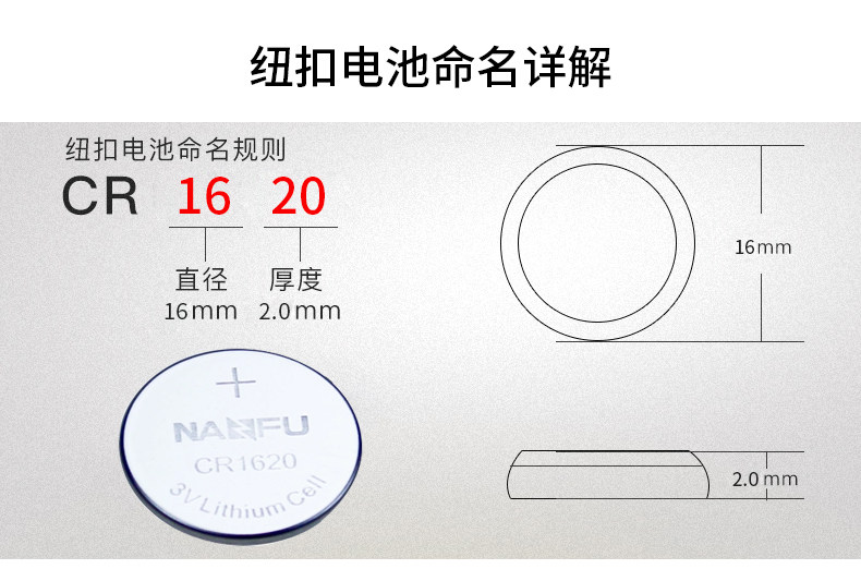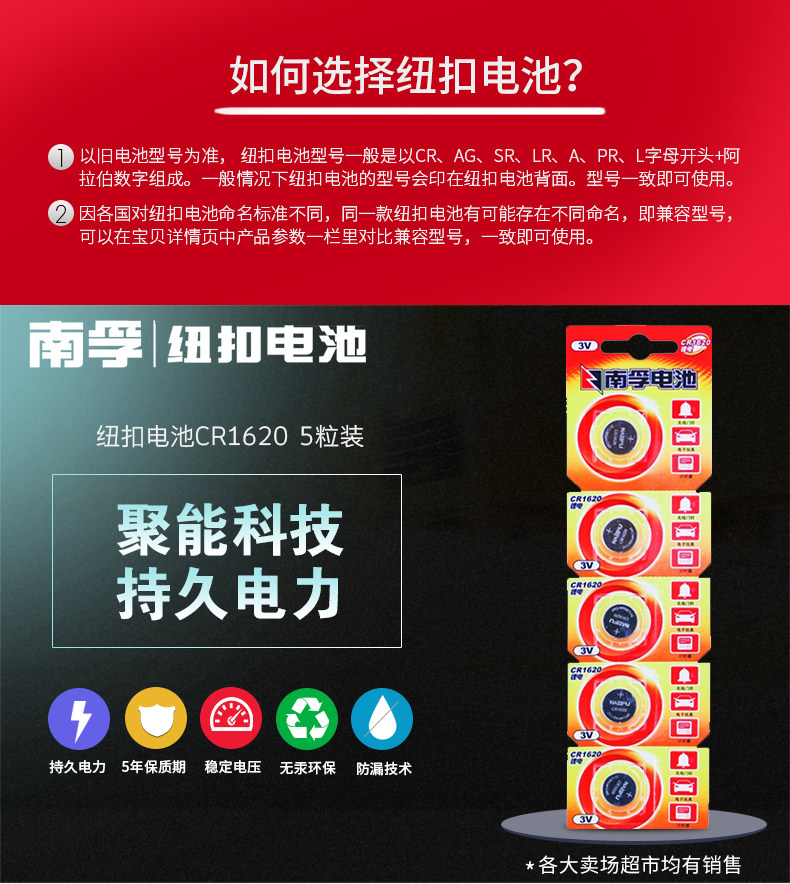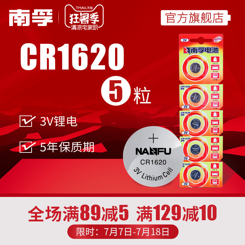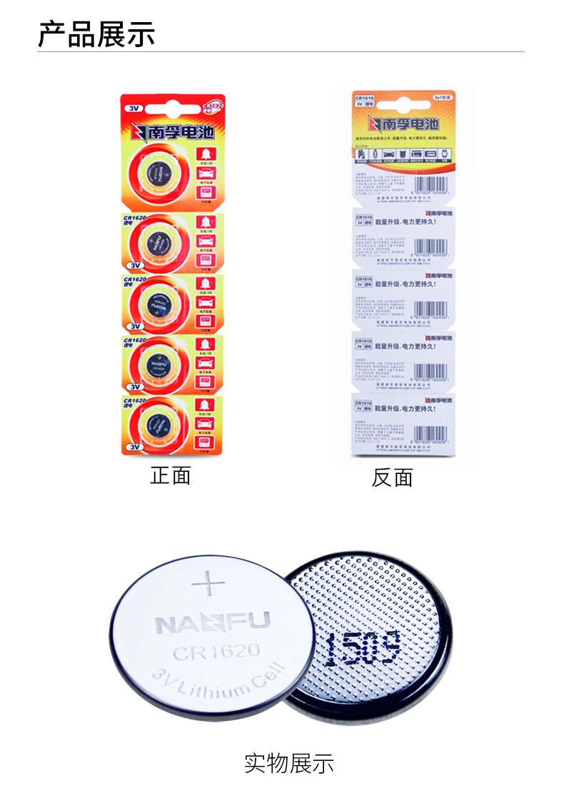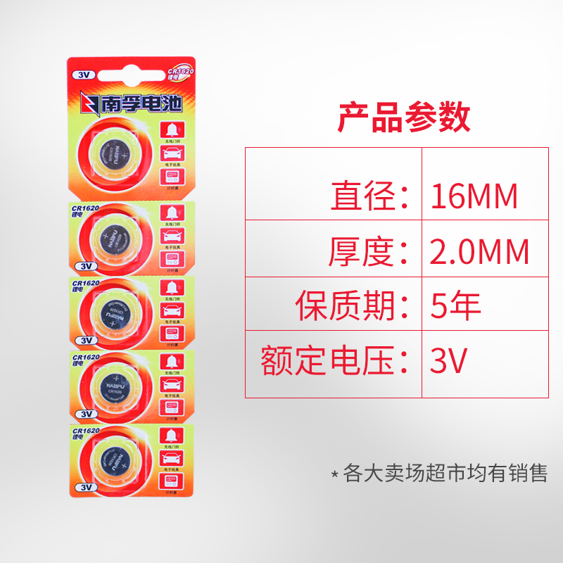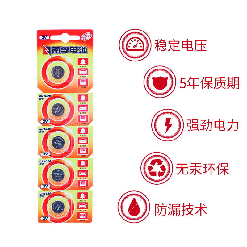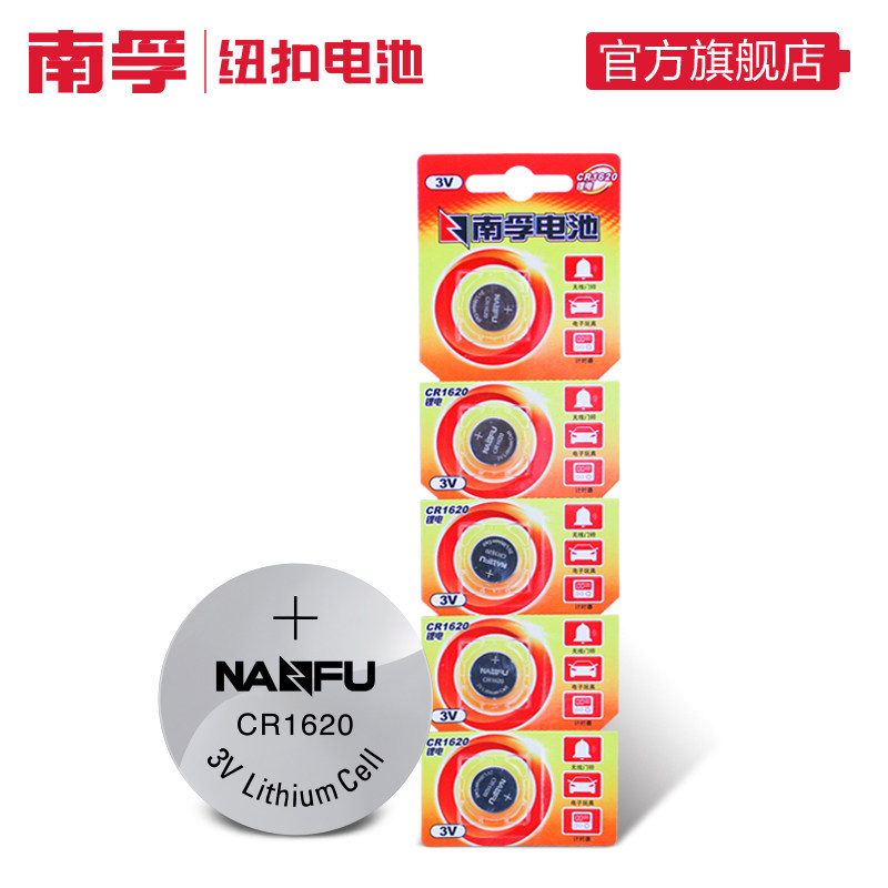 商品名称:南孚纽扣电池CR1620 3V锂电子玩具门铃马自达汽车钥匙小圆电池5粒手表体重秤电视遥控器圆形电池原装正品通用