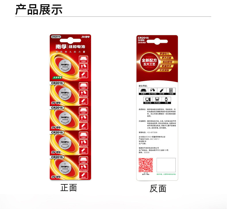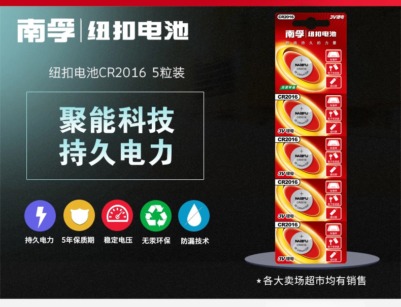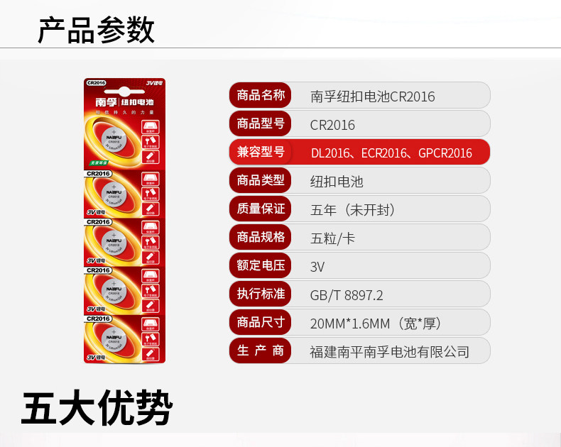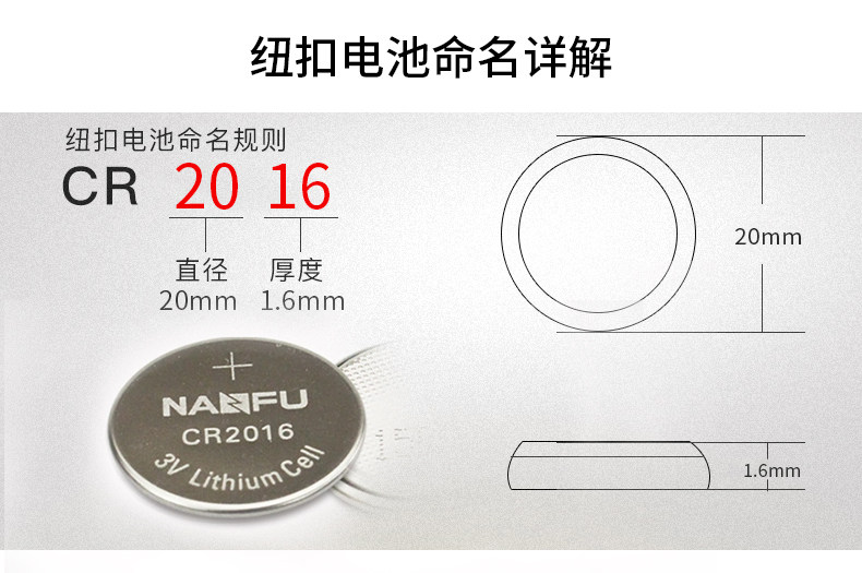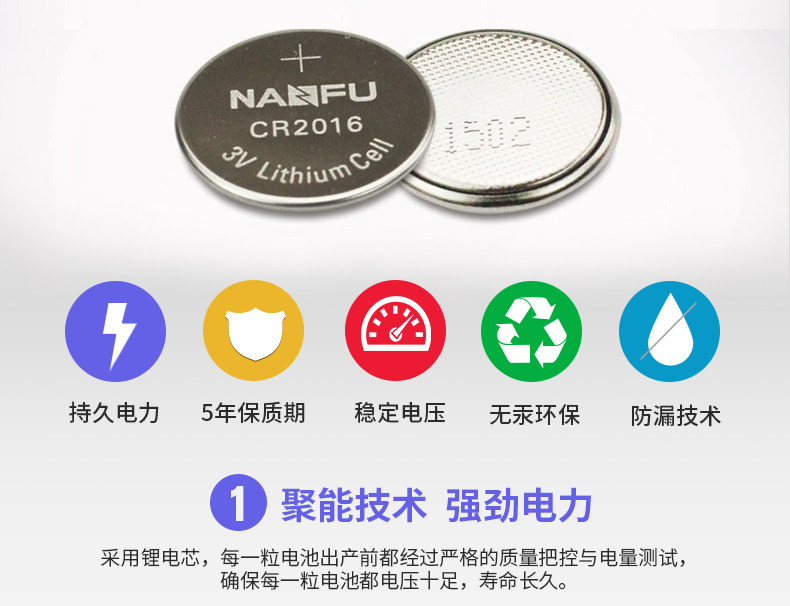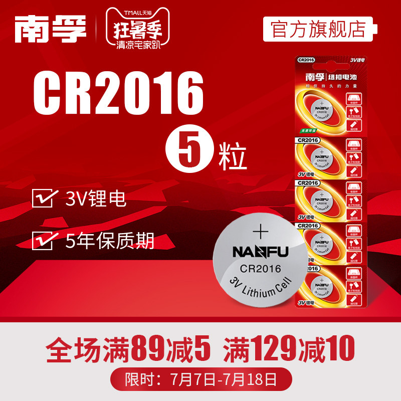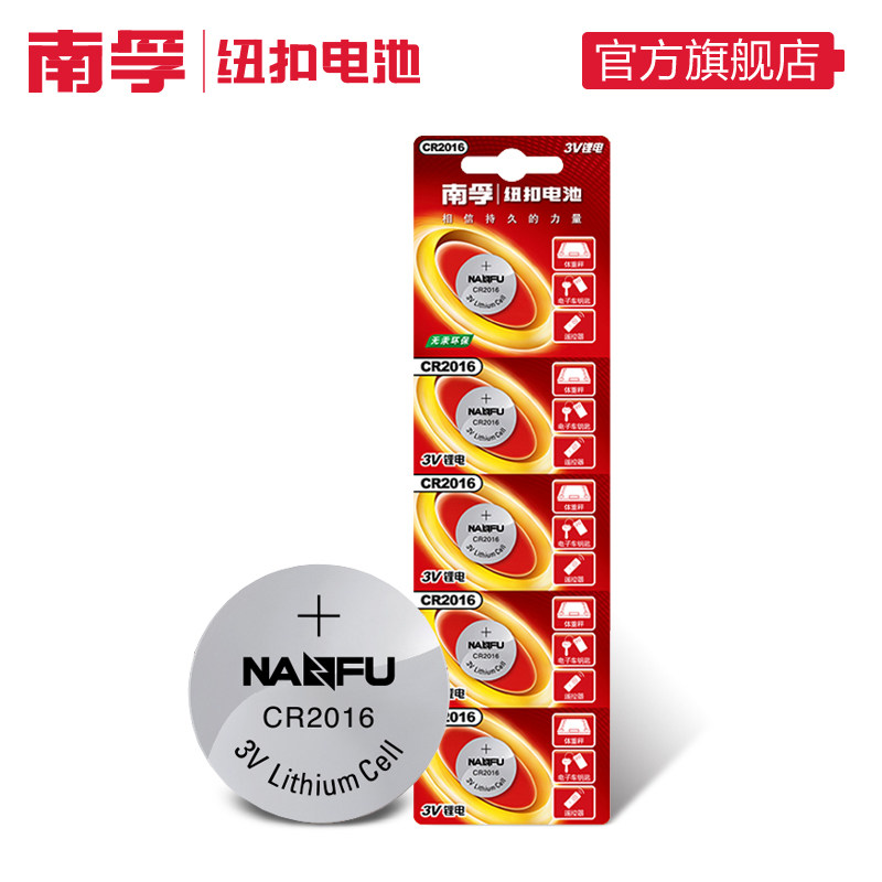 商品名称:南孚纽扣电池CR2016 3V锂电子手表主板摩托车汽车遥控器小电池5粒通用小米卡西欧dw原装圆形电池体重秤电池