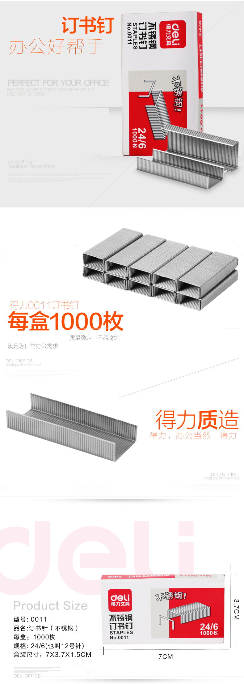 商品名称:得力(deli)0011 优质厚层订书钉订书针 办公用品 24/6 25页 0011(不锈钢)