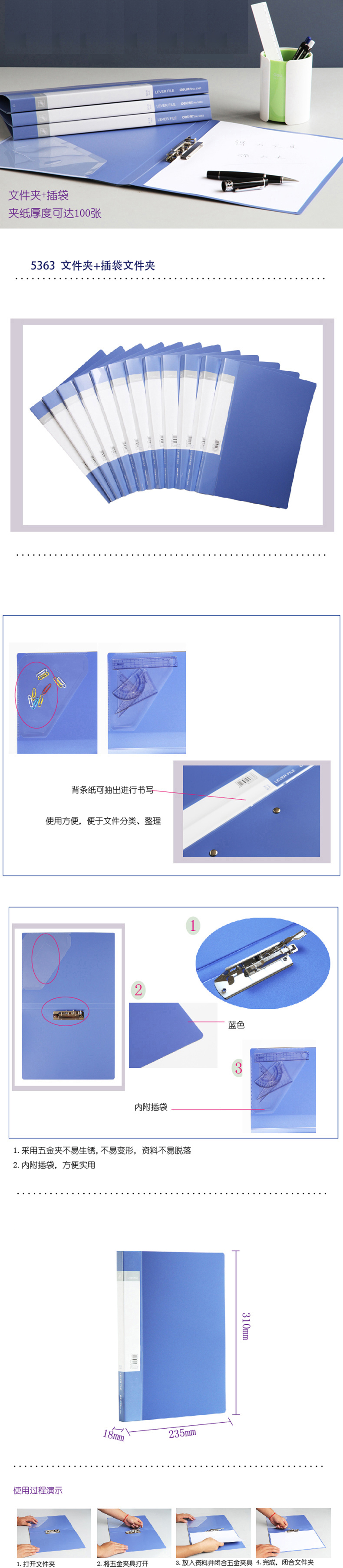 得力5363 A4文件夹单强力夹资料夹插页夹档案夹考试卷子夹办公用品