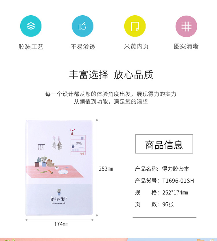 商品名称:得力(deli) T1696-01SH胶套本 B5记事本 16K笔记本 本子卡通创意本 颜色随机1本 96页-T1696-01SH