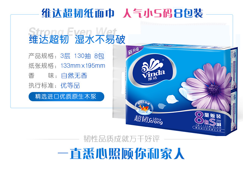 商品名称:维达V2239A软抽面巾纸家庭装无香婴儿可用3层130抽整箱一箱6提 一提8包
