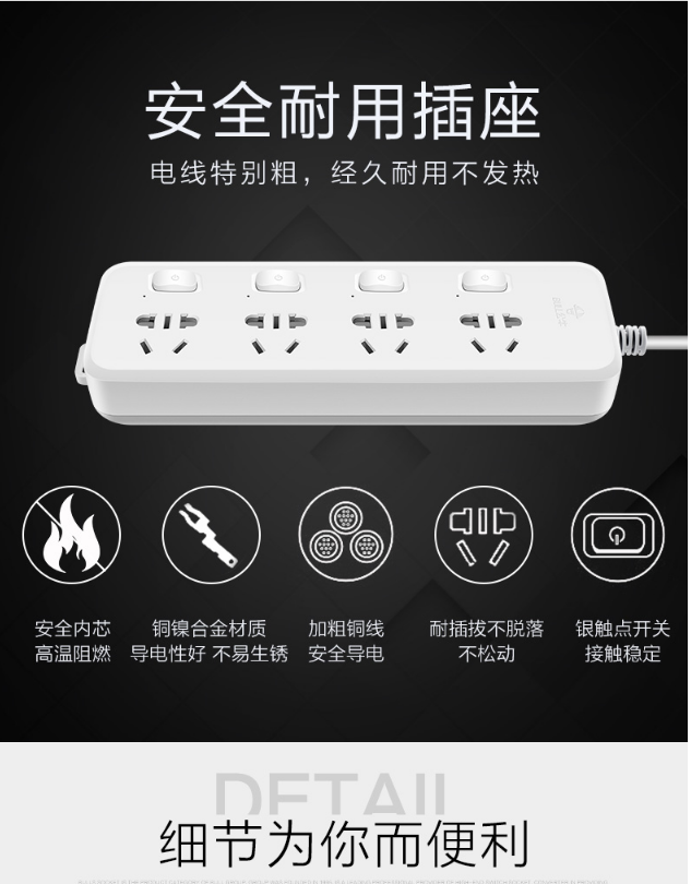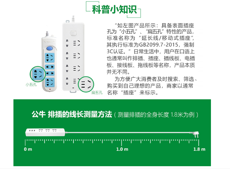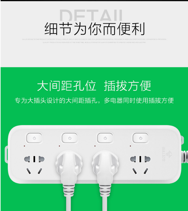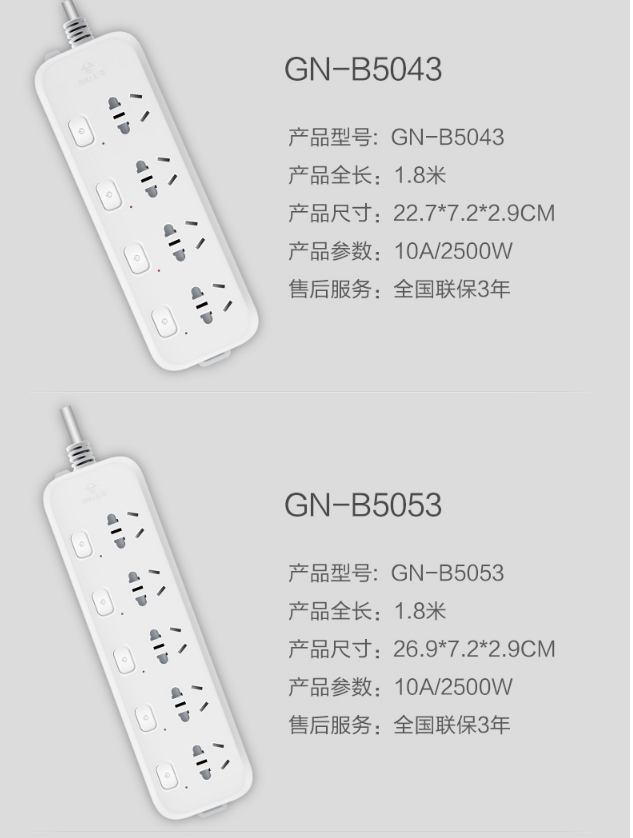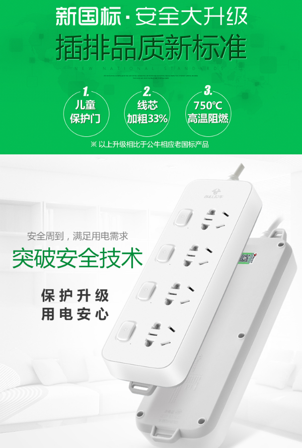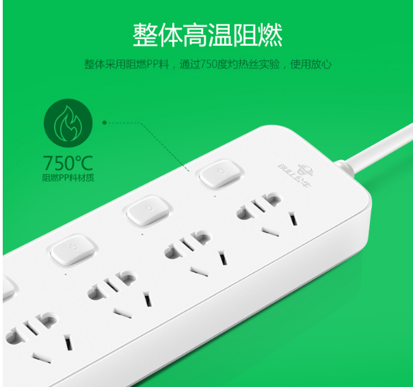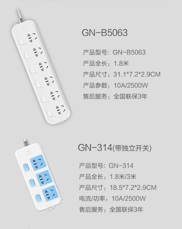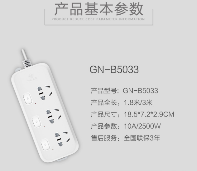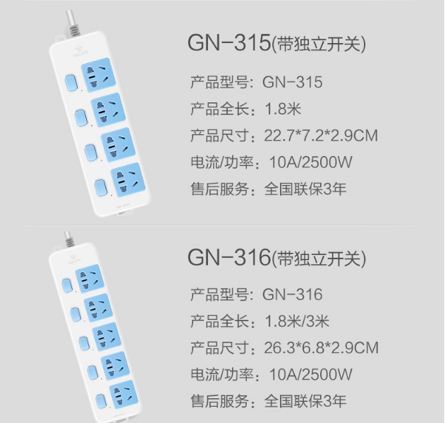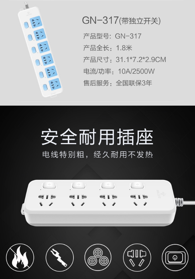 商品名称:公牛GN-316独立开关插座3米5插位