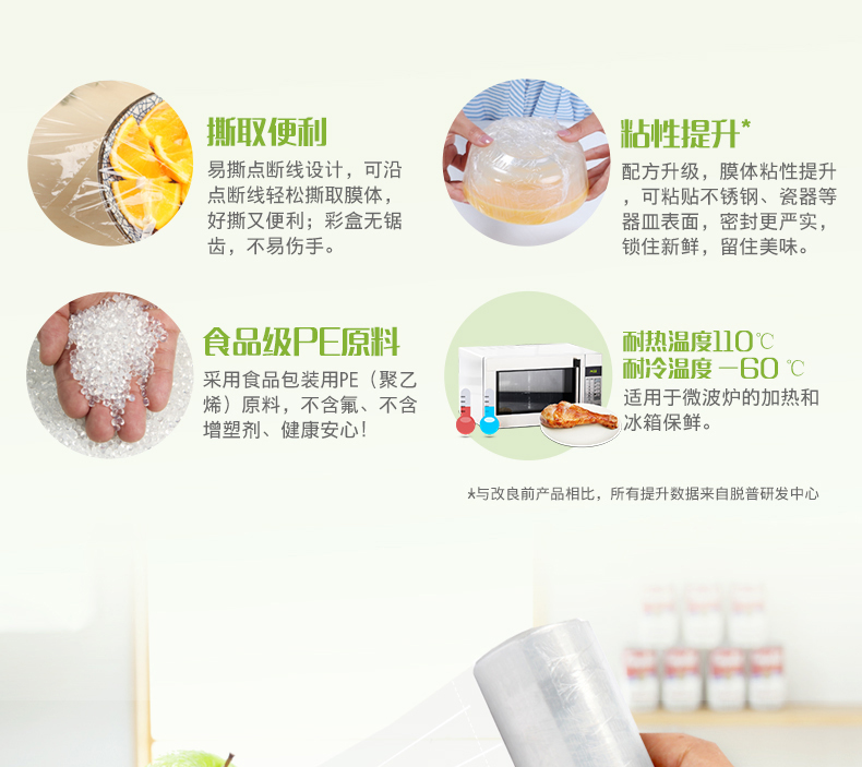 商品名称:妙洁M100D免刀撕PE保鲜膜(30cm*30米)盒