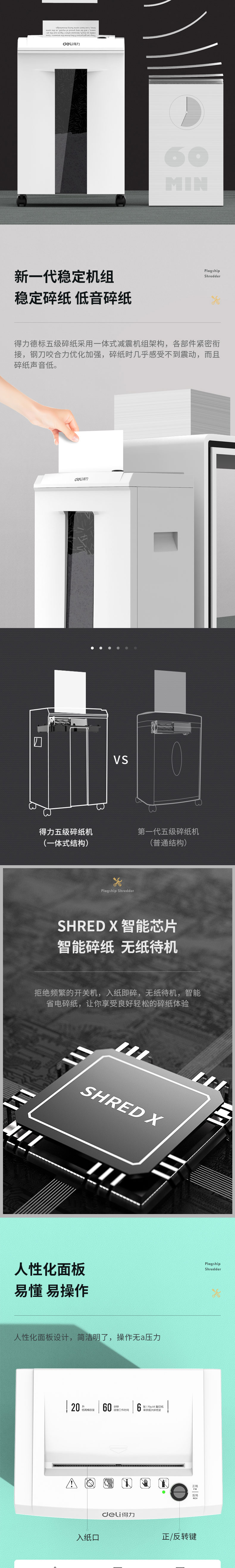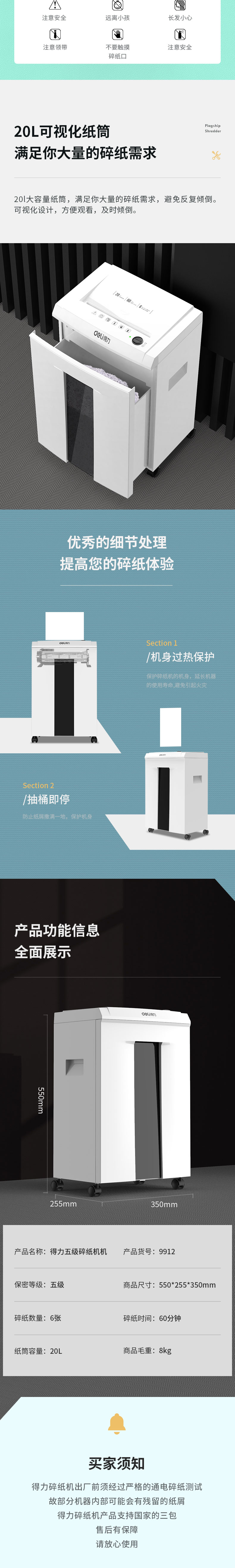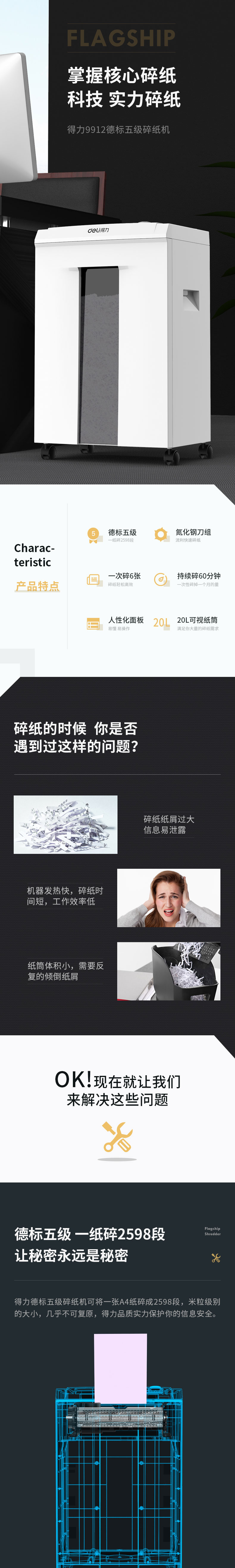 商品名称:得力9912碎纸机 5级保密 单次可碎6张 连续碎纸60分钟 最大碎纸幅面A4 容量20L 单位:台