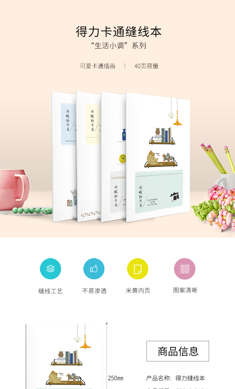 商品名称:得力(deli) FB540-01SH 得力笔记本B5印花线装记事本40页软面抄 缝线本学生记事本