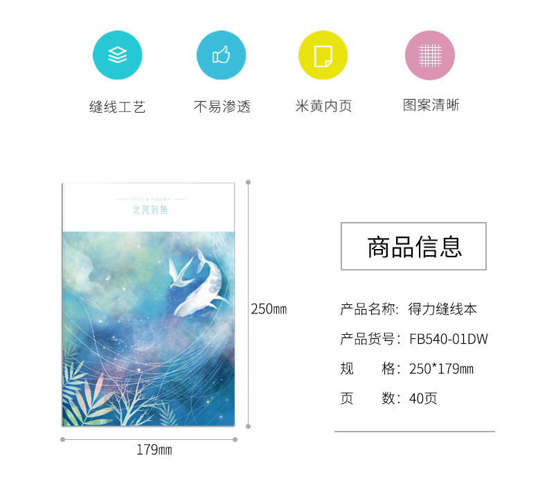 商品名称:得力(deli)FB540-01ZR 得力笔记本B5印花线装记事本40页软面抄 缝线本学生记事本 FB540-01ZR