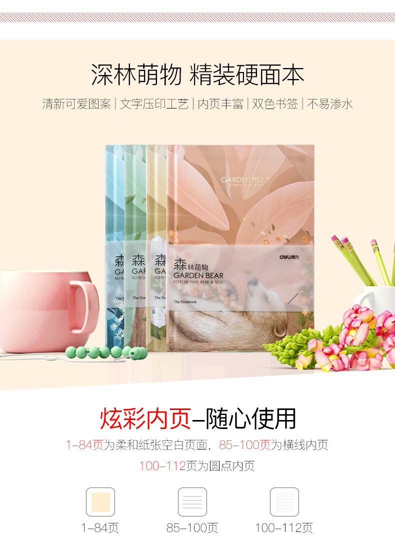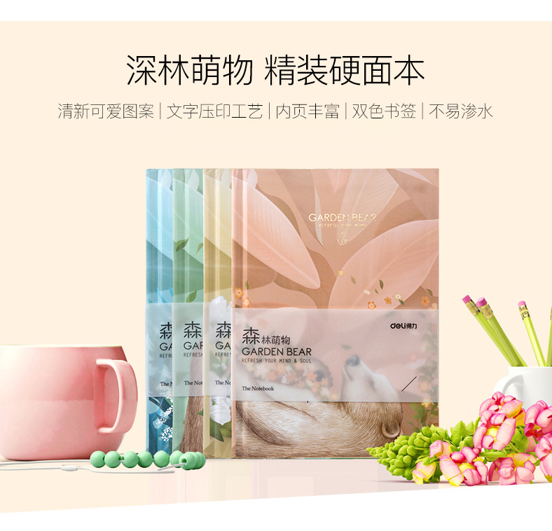 商品名称:得力YA36112-05森林萌物精装笔记本 韩版卡通小清新简约学生用4本