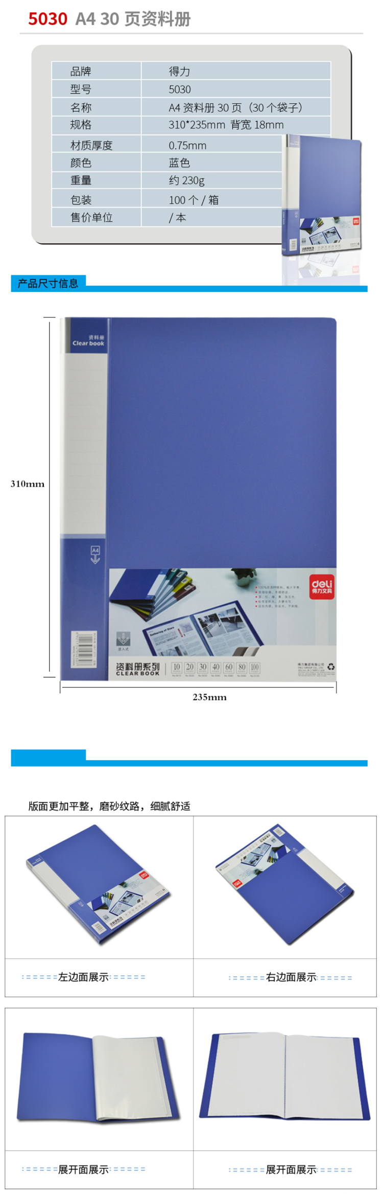 商品名称:得力(deli) 资料册资料夹插页夹办公收纳学生试卷10至100页 文件册 办公用品 5030(30页)